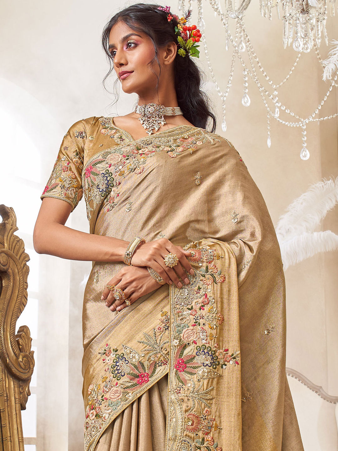 Viscose Bridal Saree in Beige and Brown with Resham work