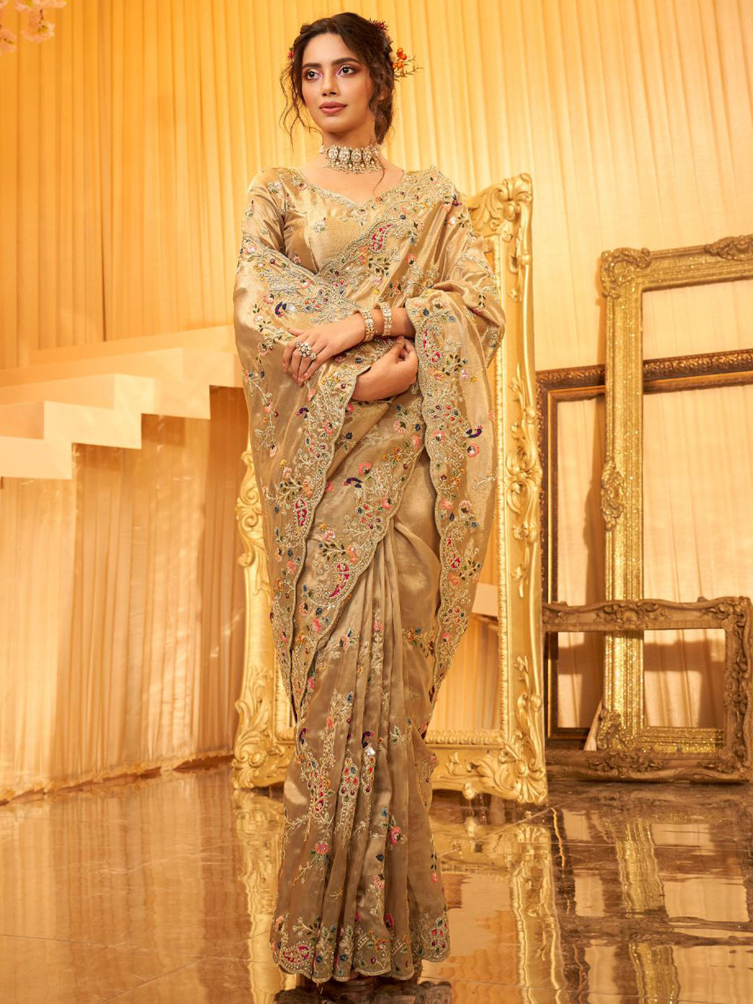 Beige and Brown color Saree in Viscose fabric with Embroidered, Resham, Weaving, Zardozi, Zari work