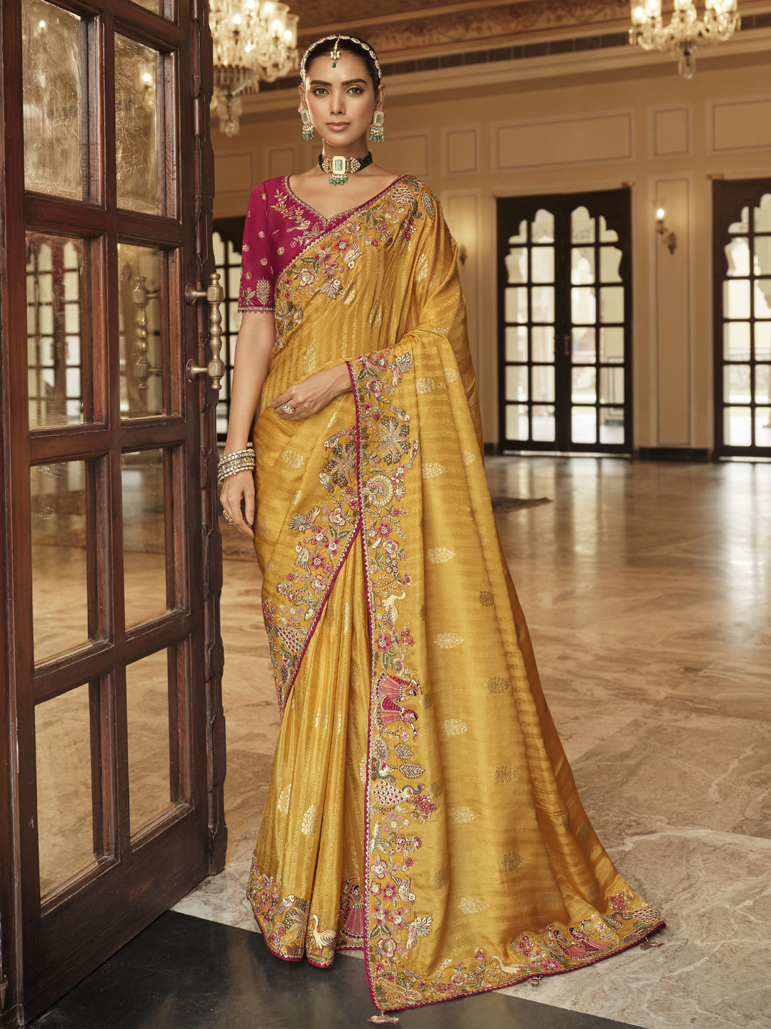 Yellow color Saree in Viscose fabric with Embroidered, Sequence, Thread, Weaving work