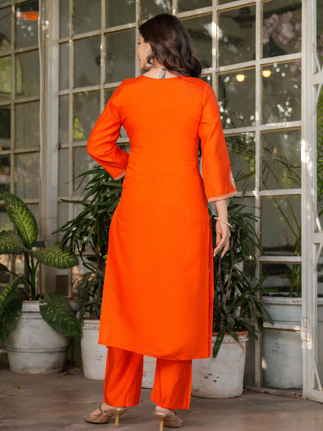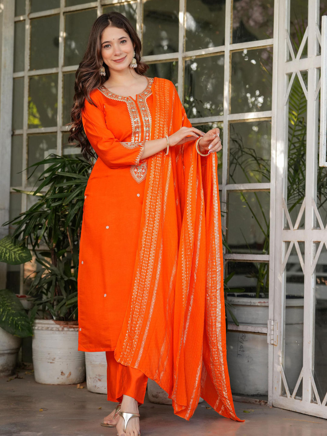 Orange color Salwar Kameez in Chanderi Silk, Viscose fabric with Embroidered work