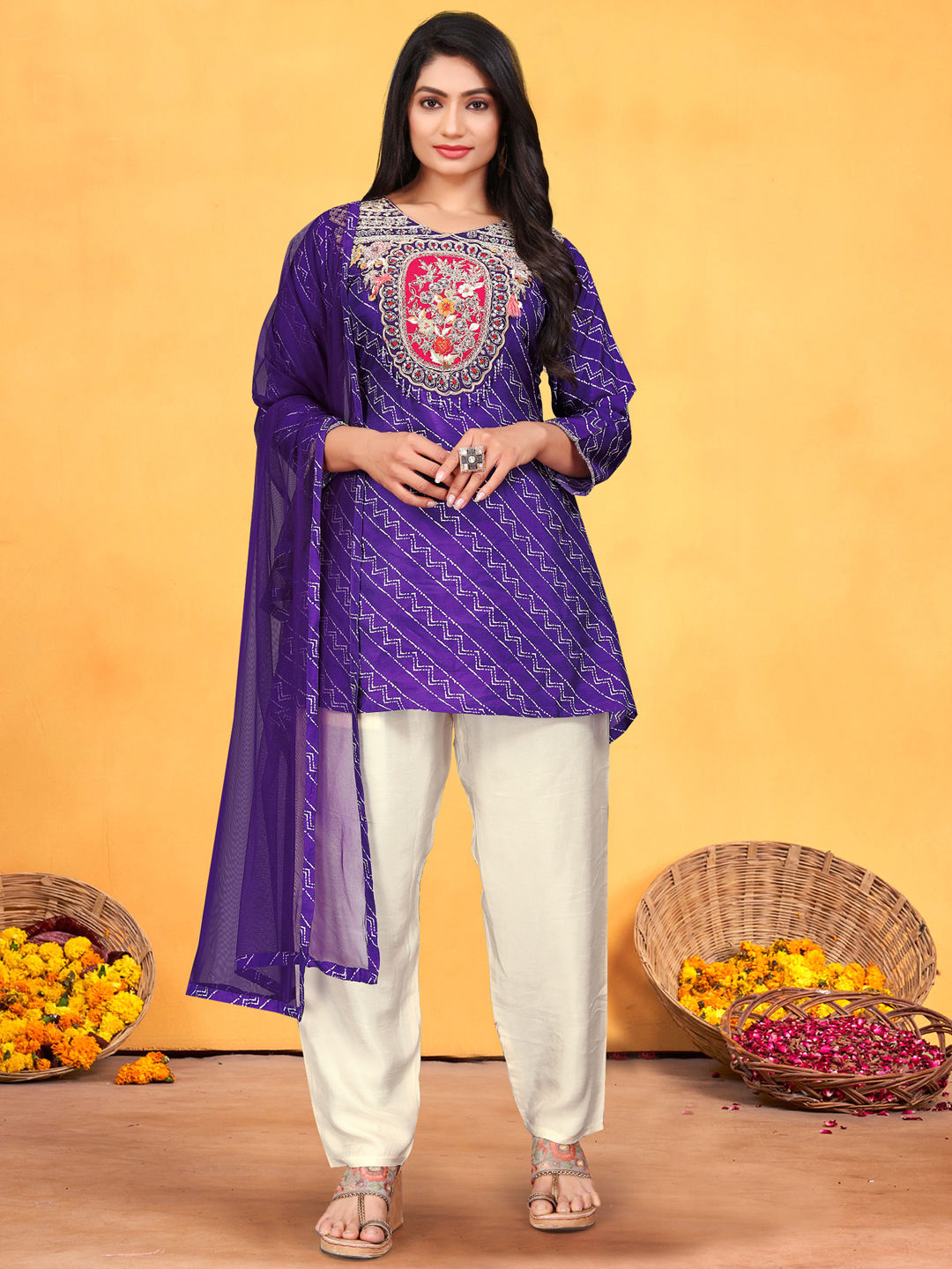 Purple and Violet color Salwar Kameez in Viscose fabric with Bandhej, Bugle Beads, Cut Dana, Printed, Stone work