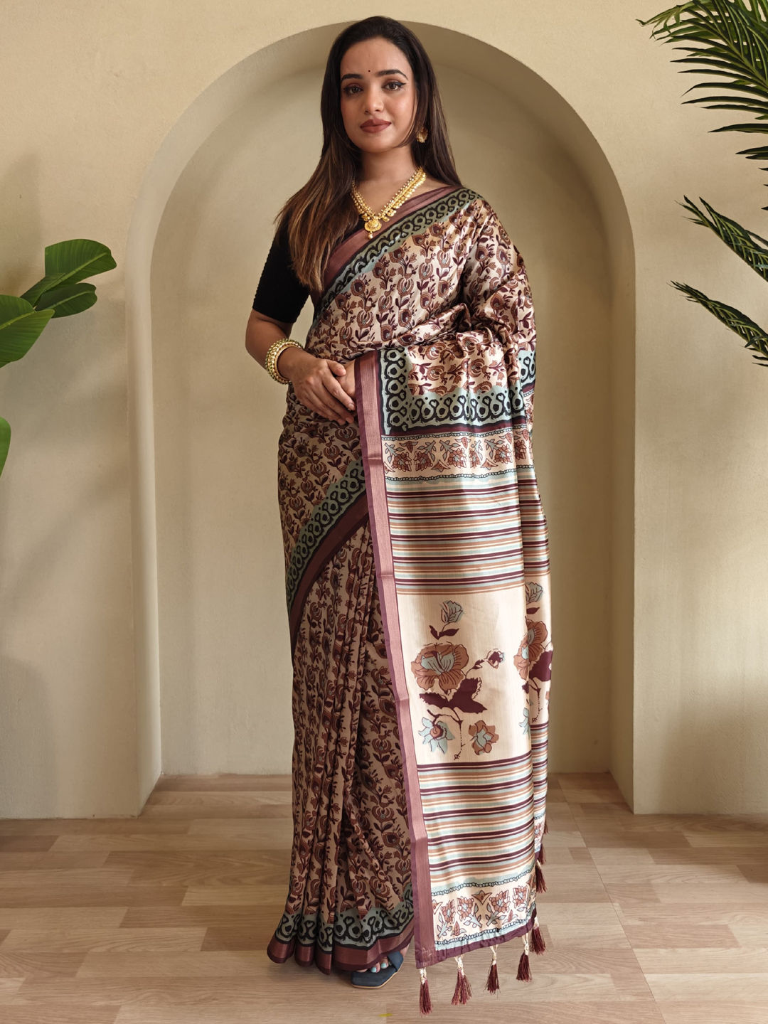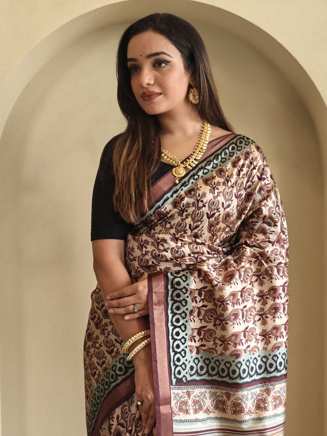 in Beige and Brown with Printed work