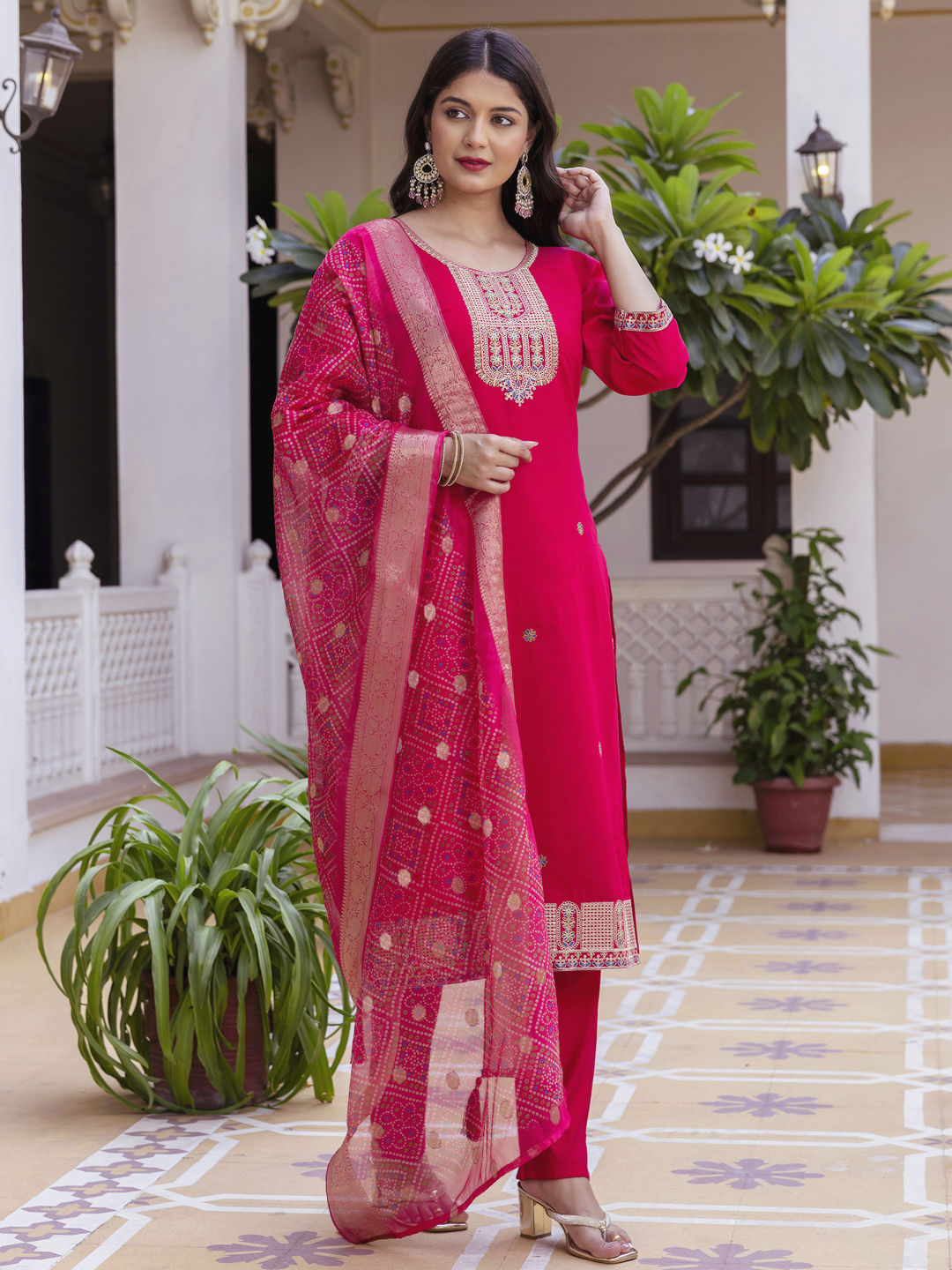 Pink and Majenta color Salwar Kameez in Chanderi Silk, Viscose fabric with Embroidered, Thread work