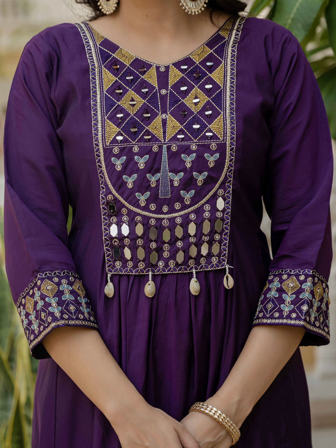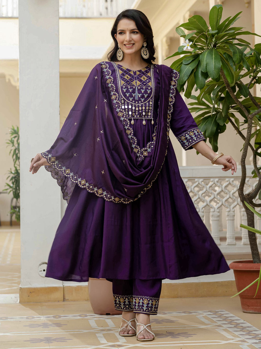 Purple and Violet color Salwar Kameez in Roman Silk, Viscose fabric with Embroidered, Mirror, Sequence, Thread work