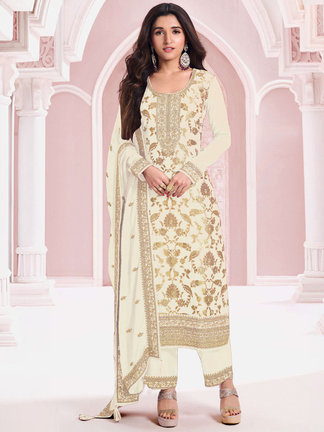 in White and Off White with Weaving work