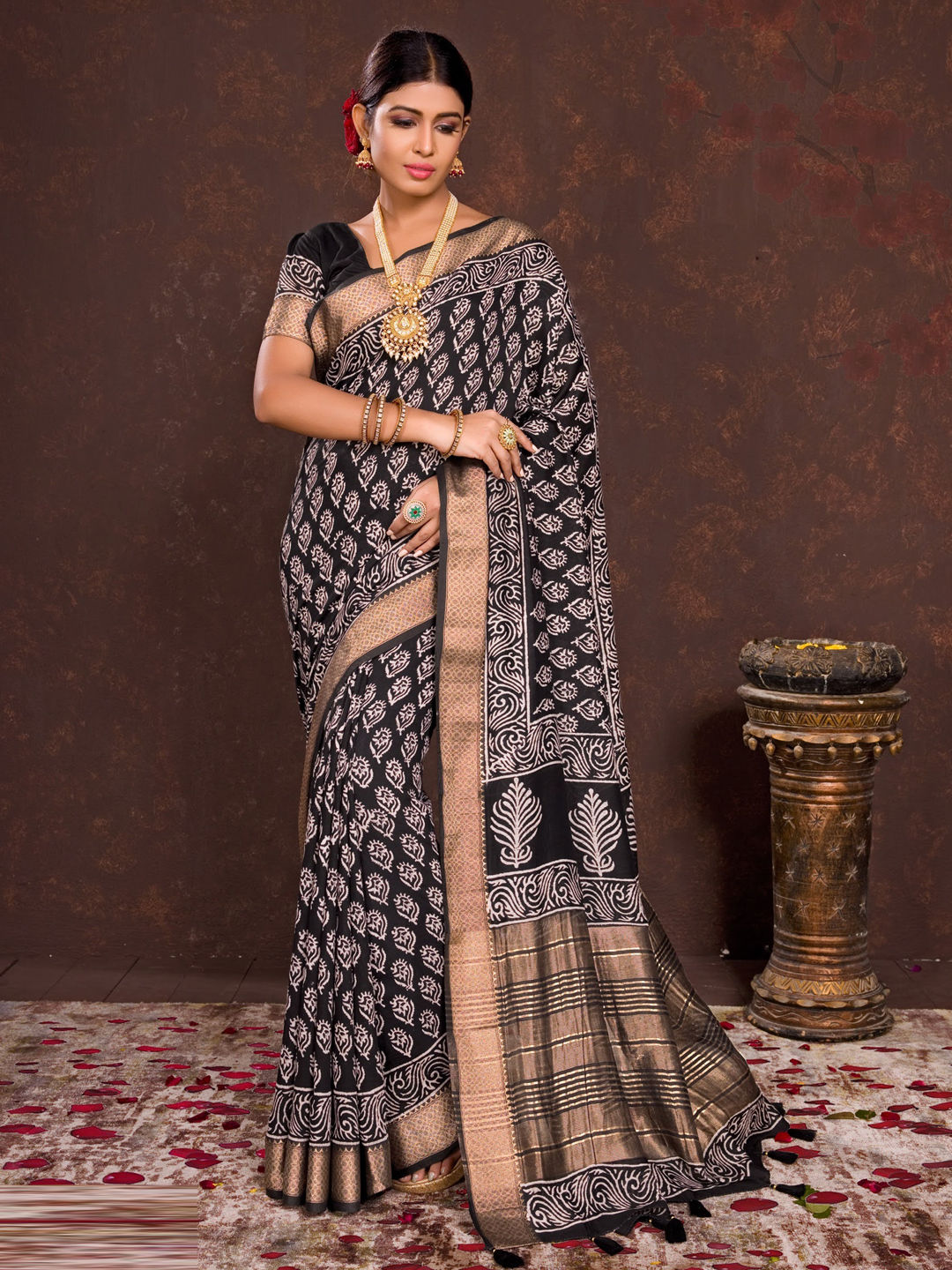 Black and Grey color Saree in Viscose fabric with Printed, Weaving work
