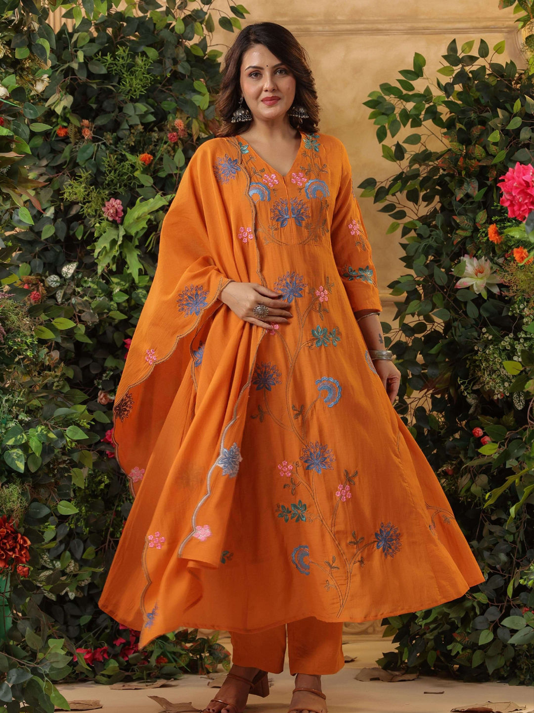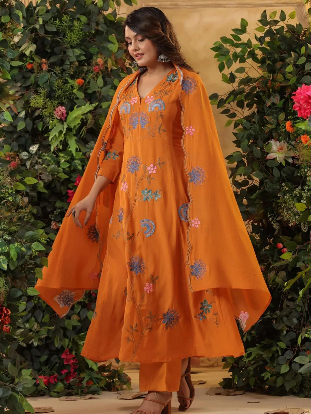 Orange color Salwar Kameez in Chanderi Silk, Viscose fabric with Embroidered work