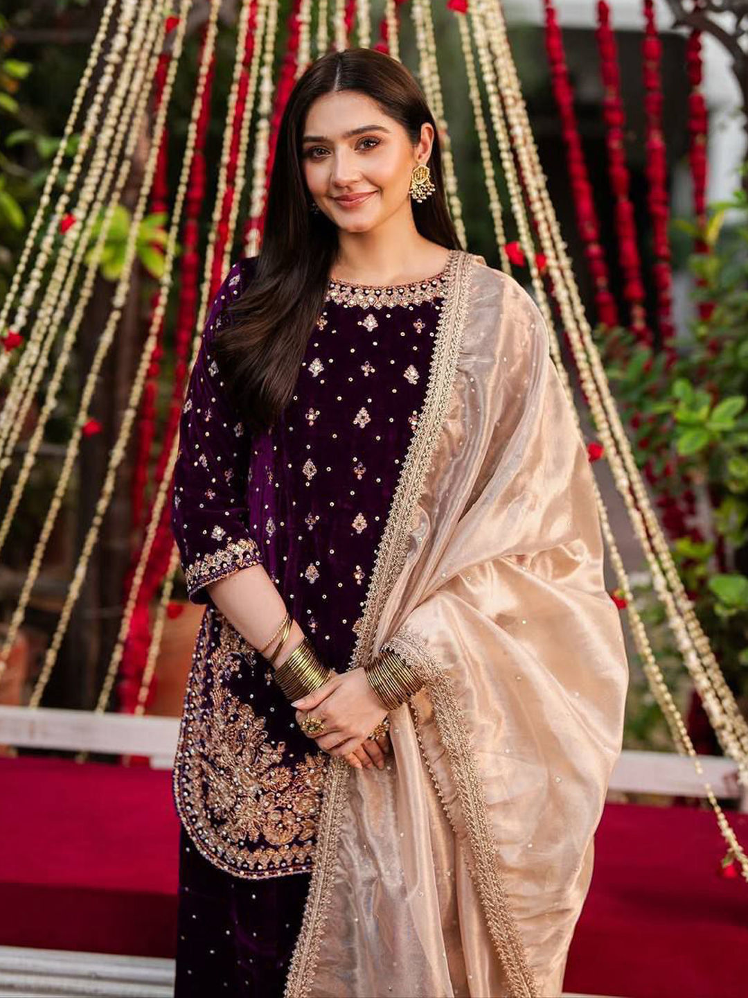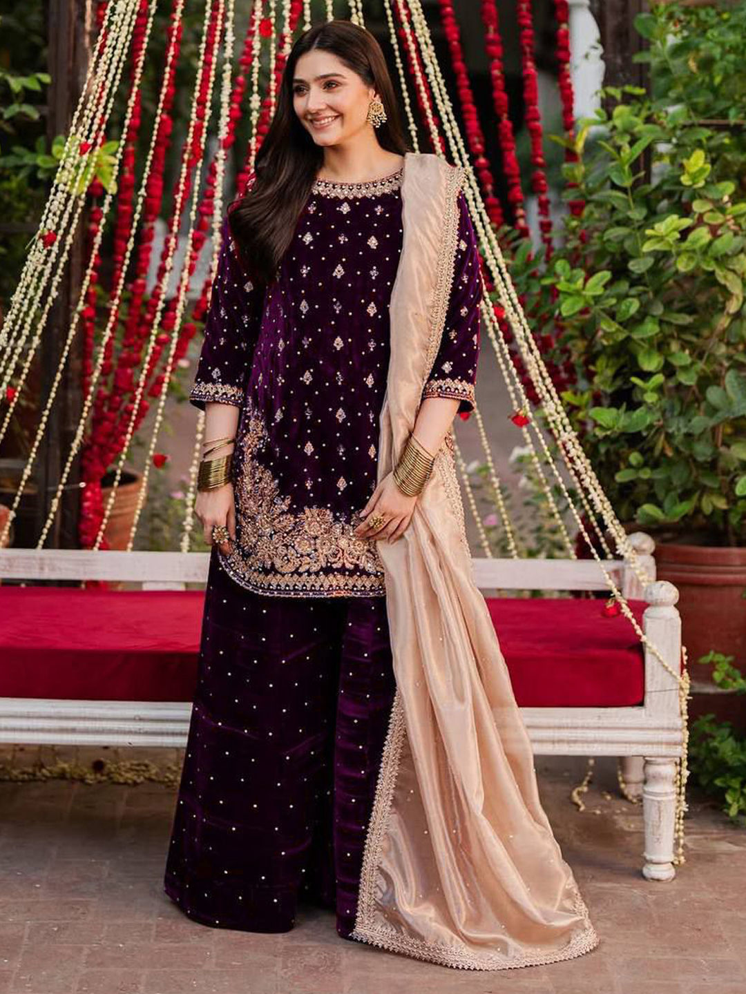 Purple and Violet color Salwar Kameez in Velvet, Viscose fabric with Moti, Sequence, Thread work