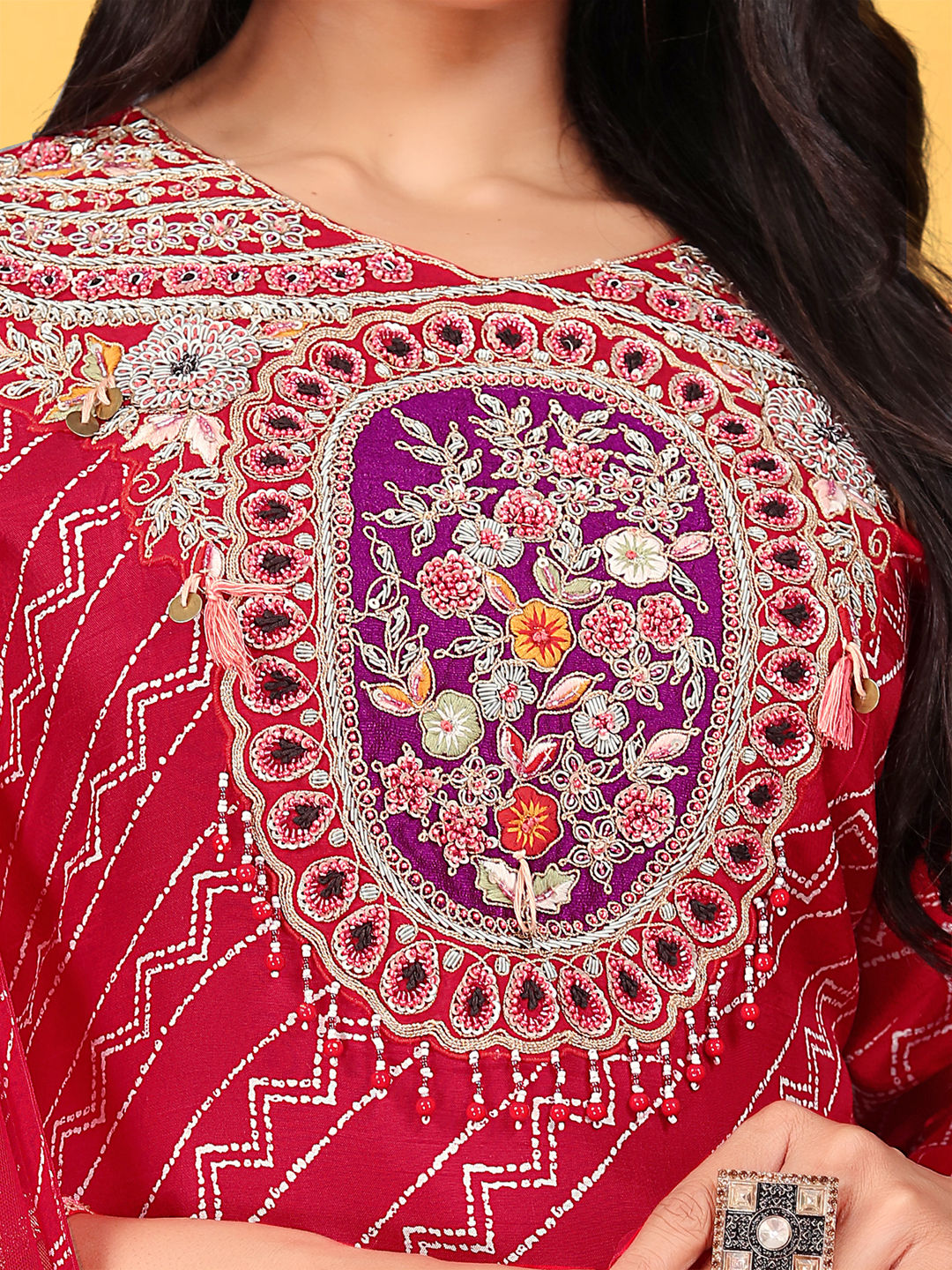 Red and Maroon color Salwar Kameez in Viscose fabric with Bandhej, Bugle Beads, Cut Dana, Embroidered, Printed, Stone work