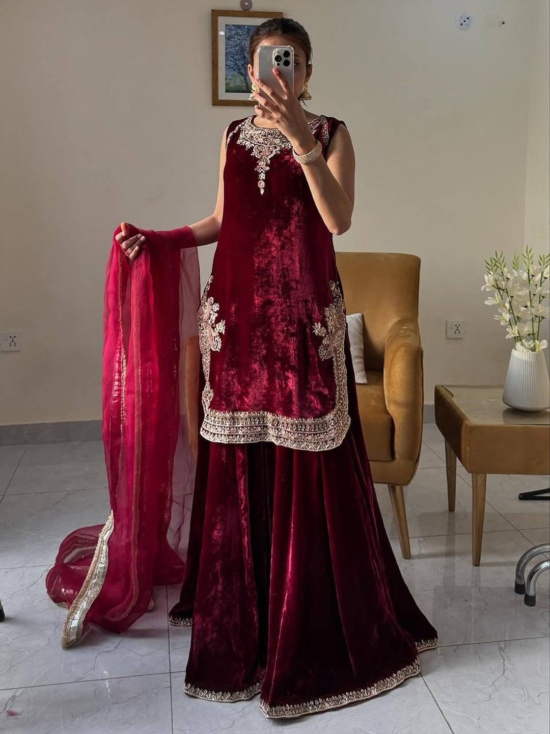 Red and Maroon color Salwar Kameez in Velvet, Viscose fabric with Embroidered, Sequence work