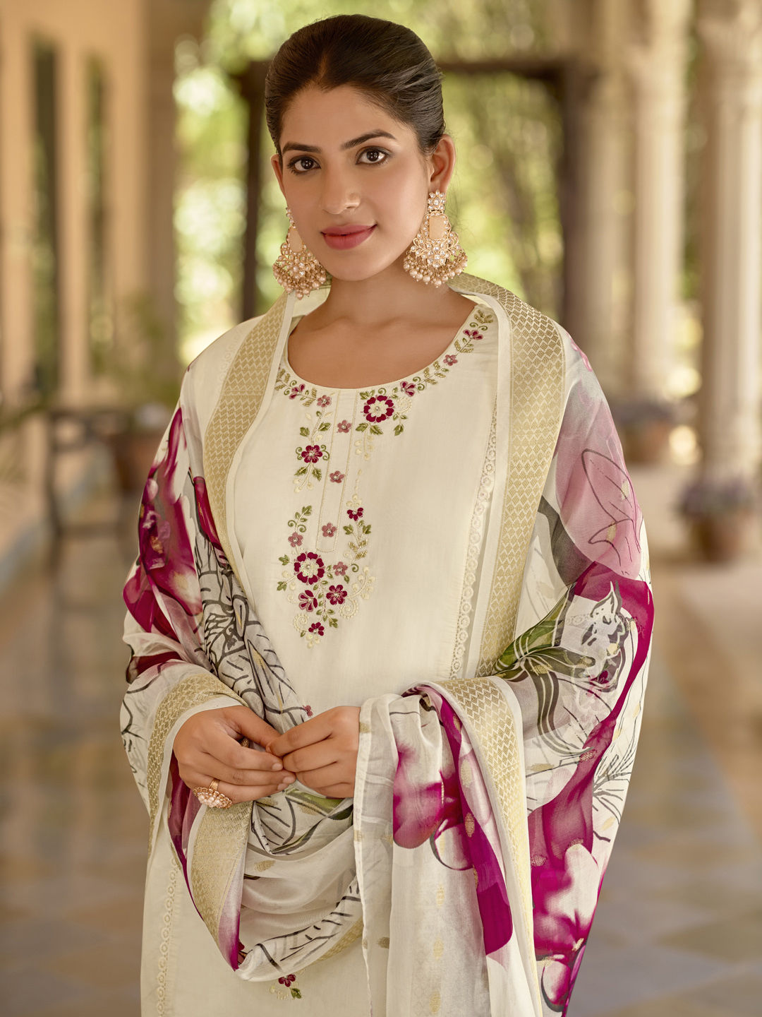 White and Off White color Salwar Kameez in Viscose fabric with Embroidered work