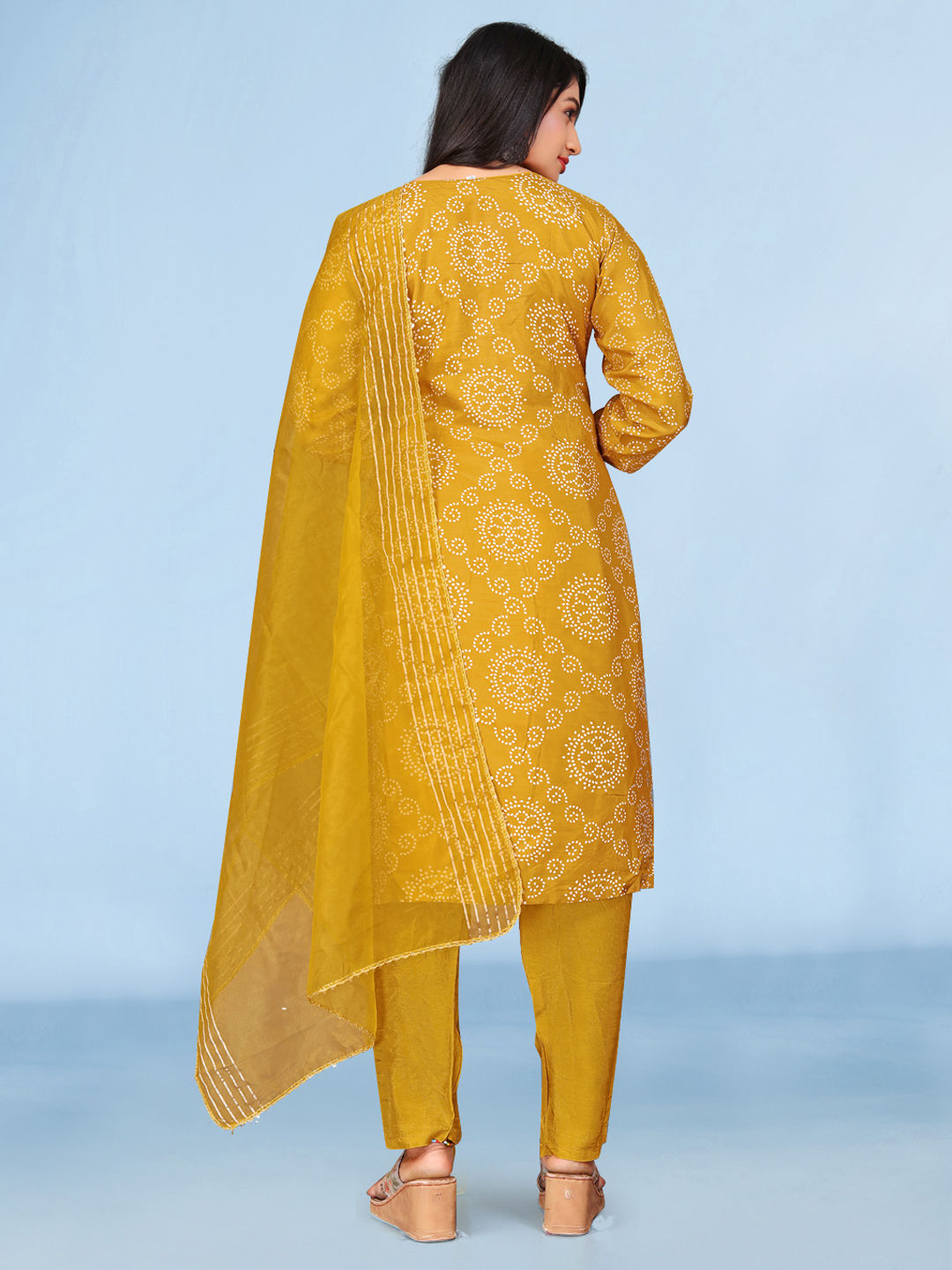 Yellow color Salwar Kameez in Viscose fabric with Bandhej, Bugle Beads, Cut Dana, Embroidered, Printed, Stone work