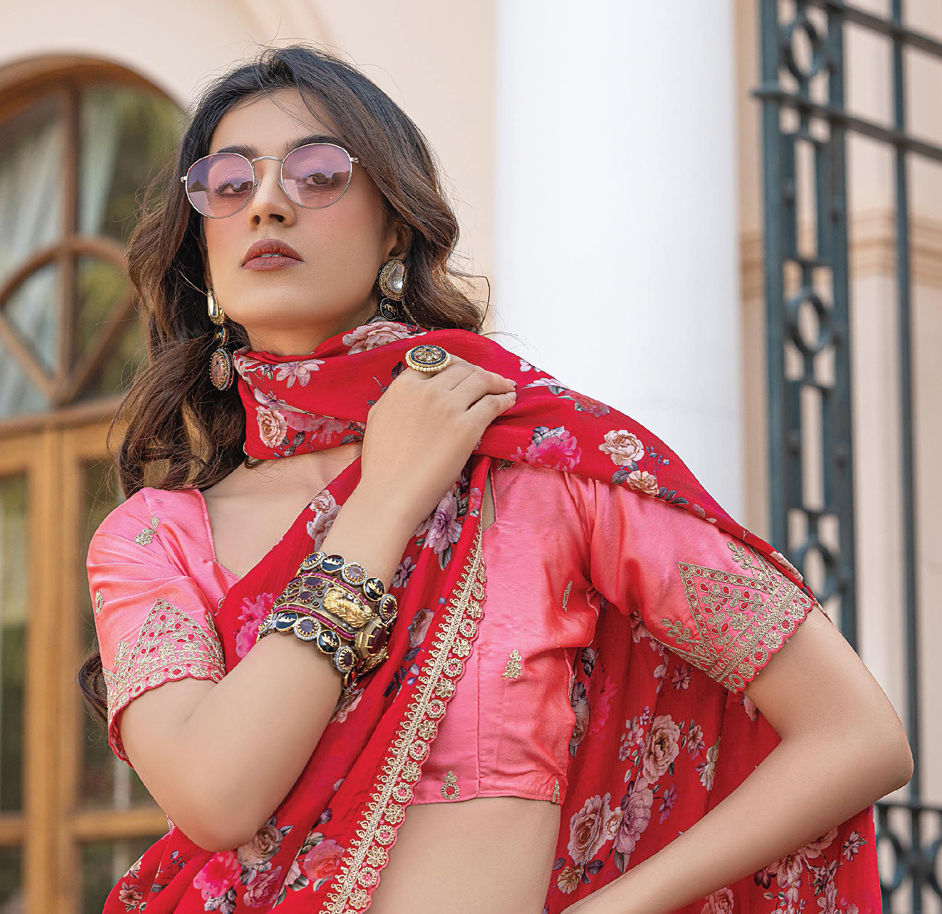 Viscose Festive Saree in Pink and Majenta with Floral work