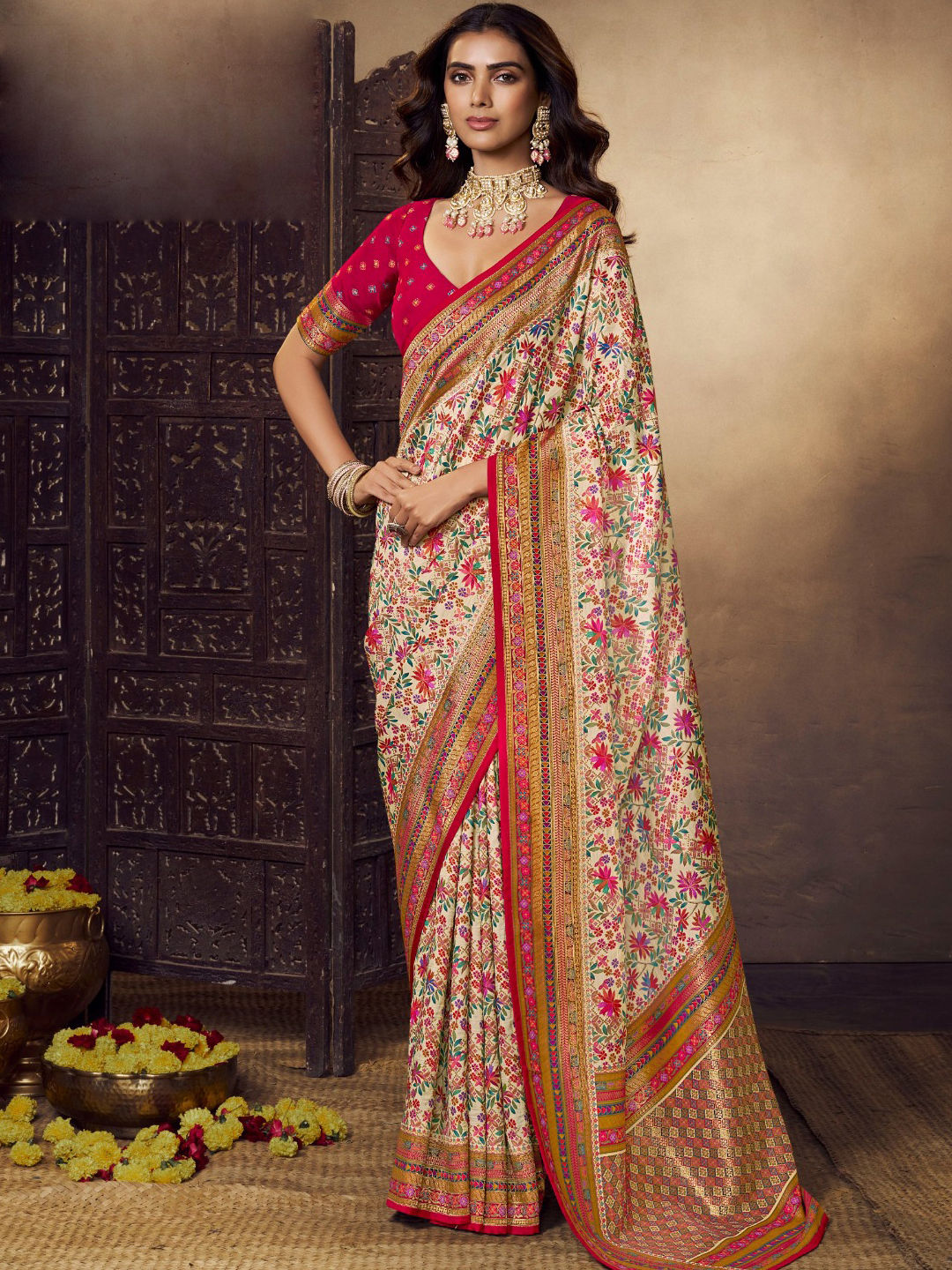 Viscose Traditional Saree in Beige and Brown with Printed work