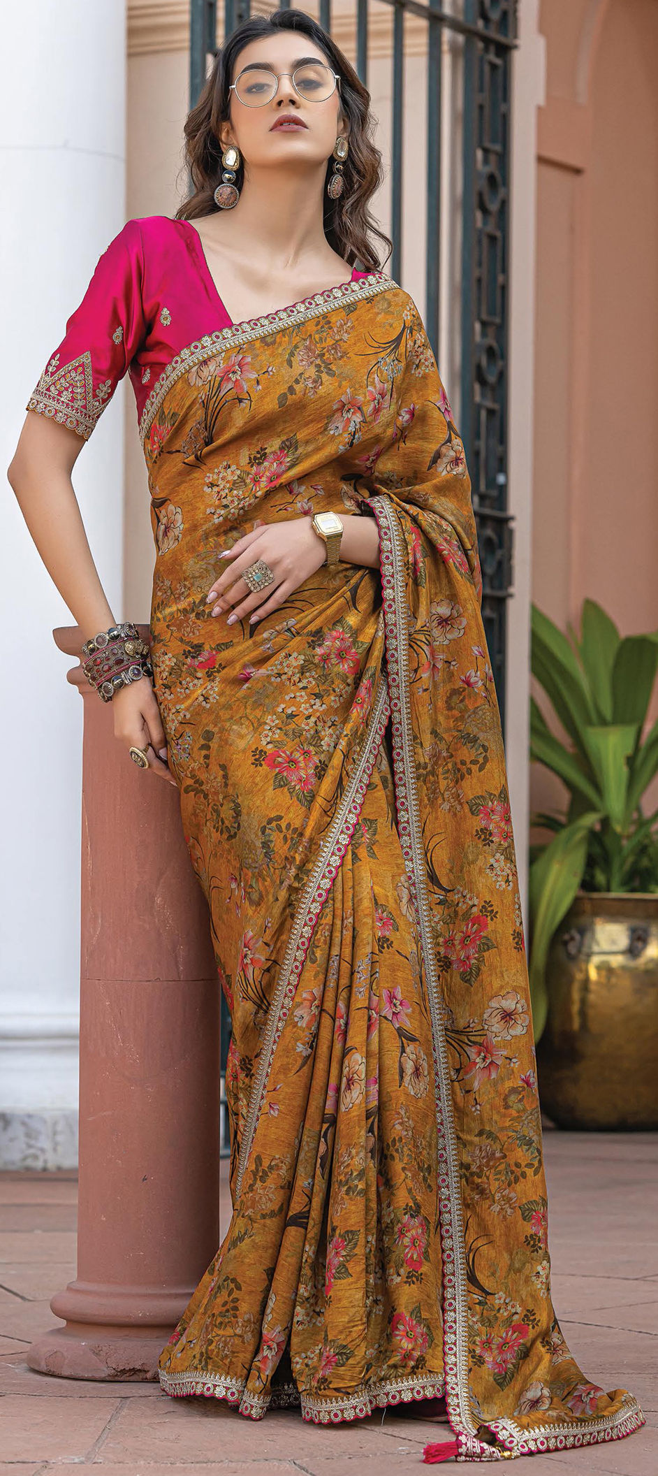Viscose Festive Saree in Pink and Majenta with Floral work