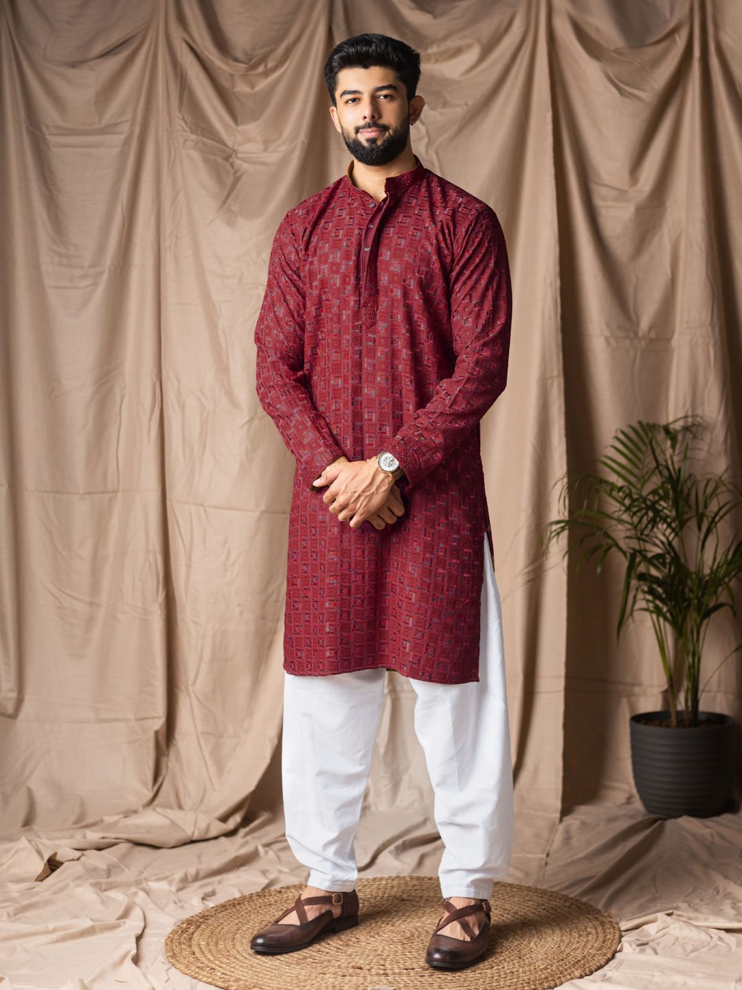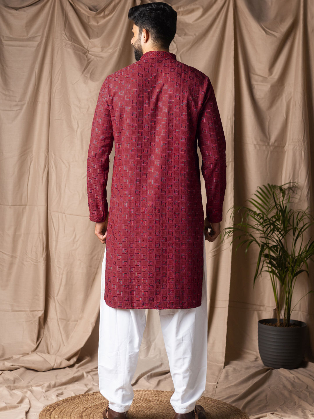 Viscose Wedding Kurta Pyjamas in Red and Maroon with Resham work