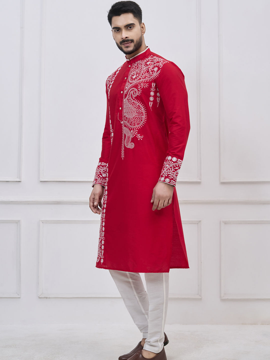 Red and Maroon color Kurta Pyjamas in Viscose fabric with Embroidered, Thread work
