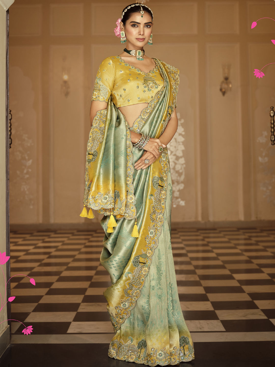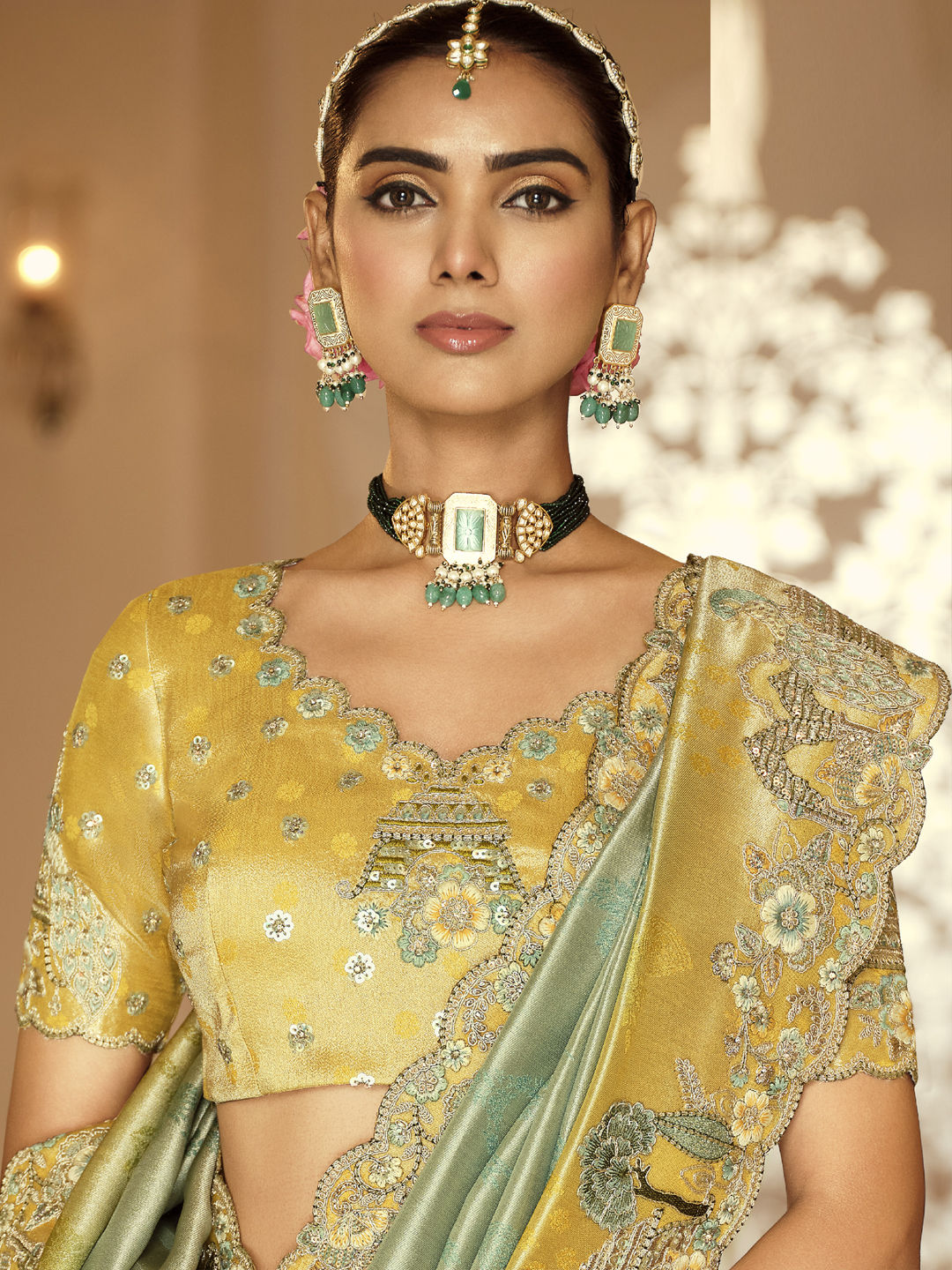 Gold, Green color Saree in Viscose fabric with Embroidered, Sequence, Thread, Weaving work