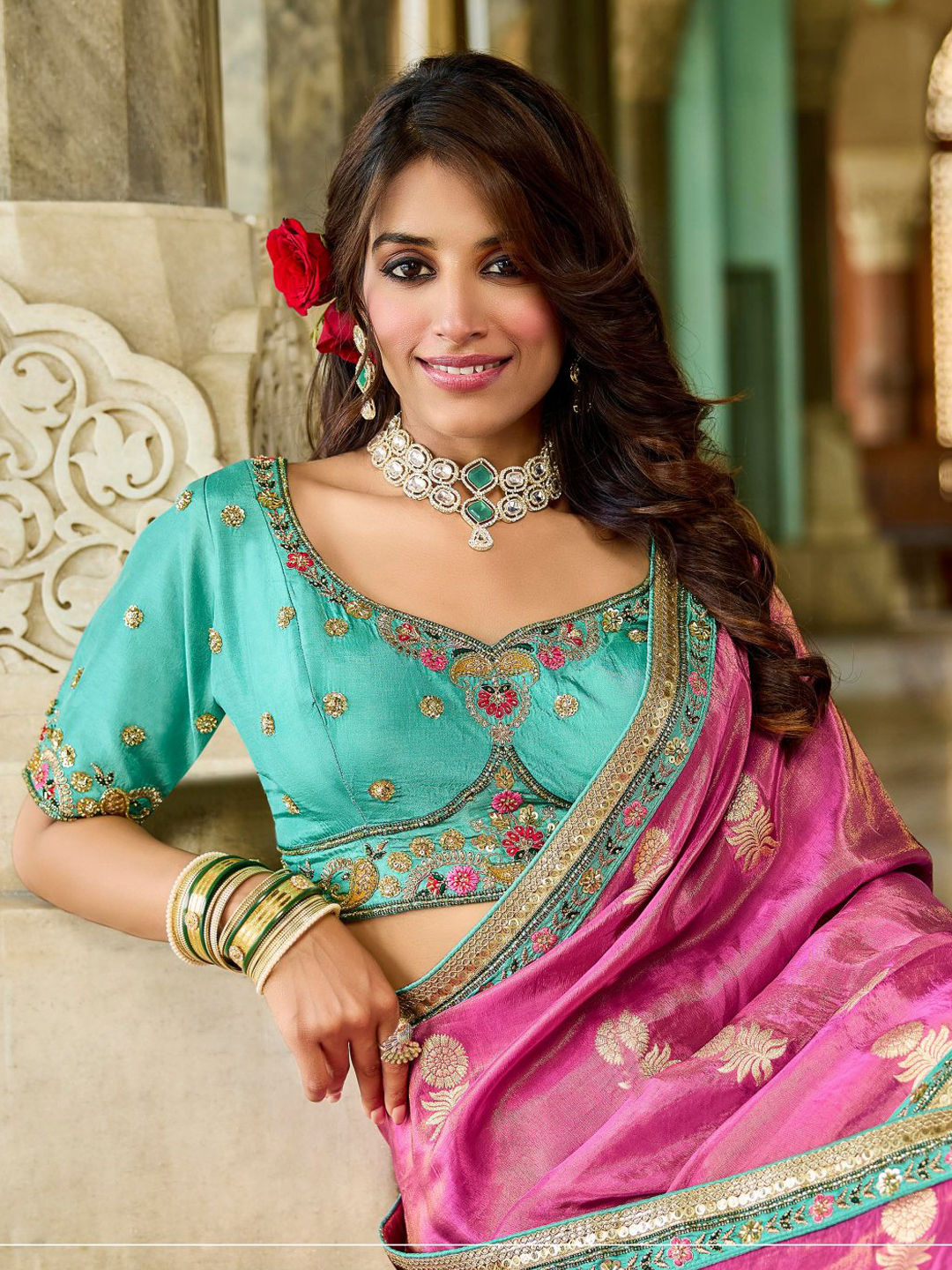 Pink and Majenta color Saree in Tissue, Viscose fabric with Border, Embroidered, Zari work