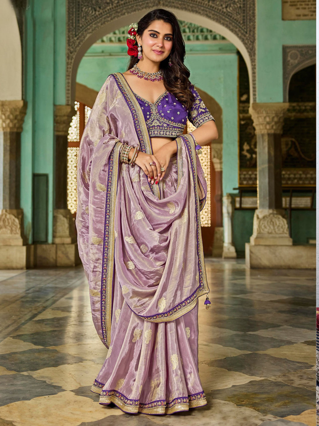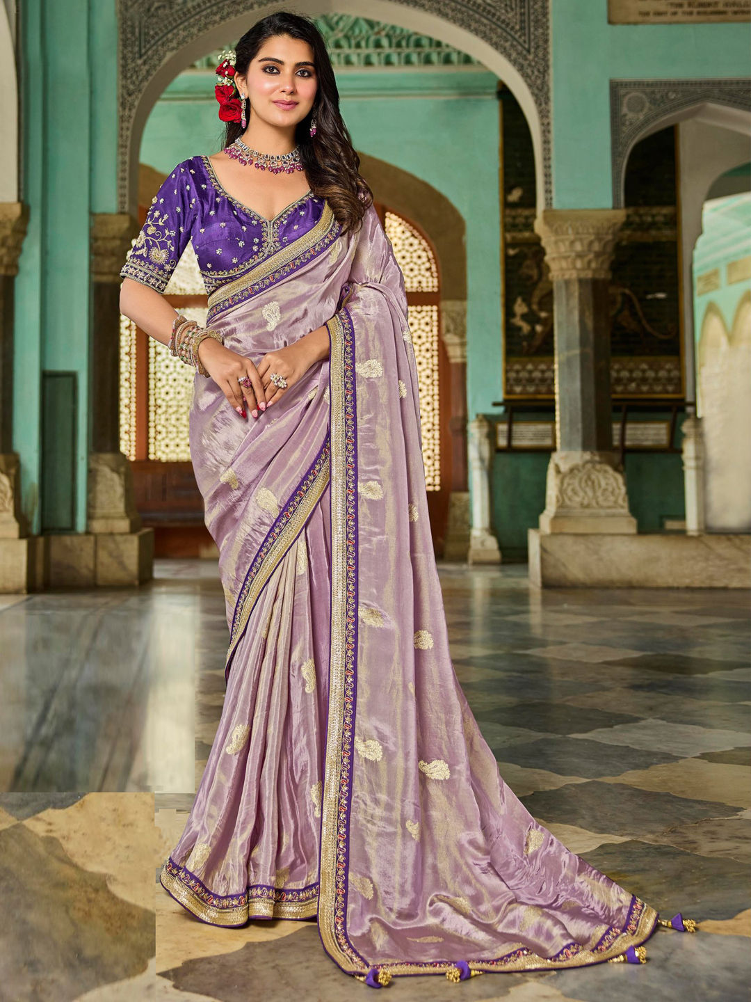 Purple and Violet color Saree in Tissue, Viscose fabric with Border, Embroidered, Zari work