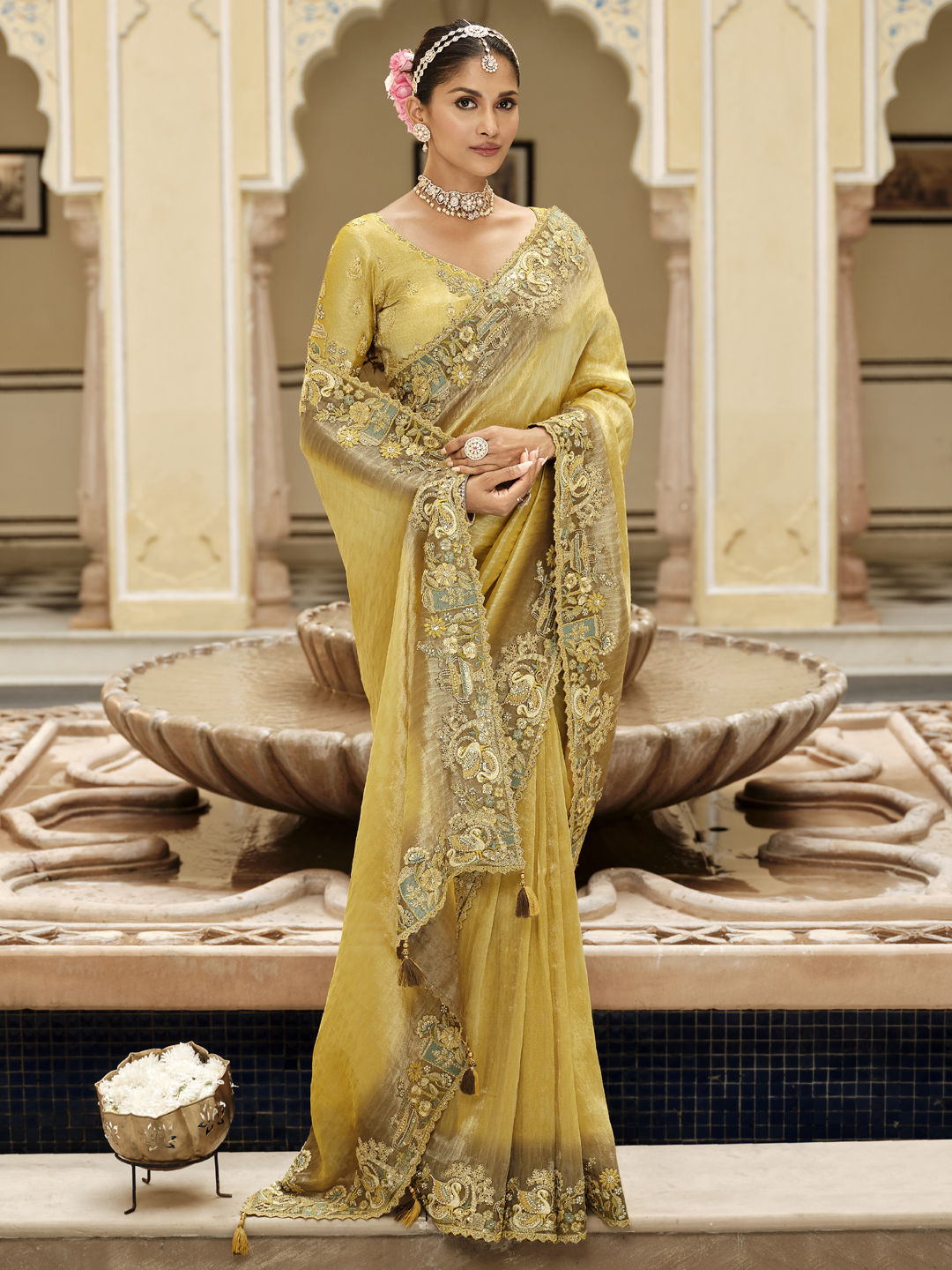 Viscose Wedding Saree in Yellow with Thread work