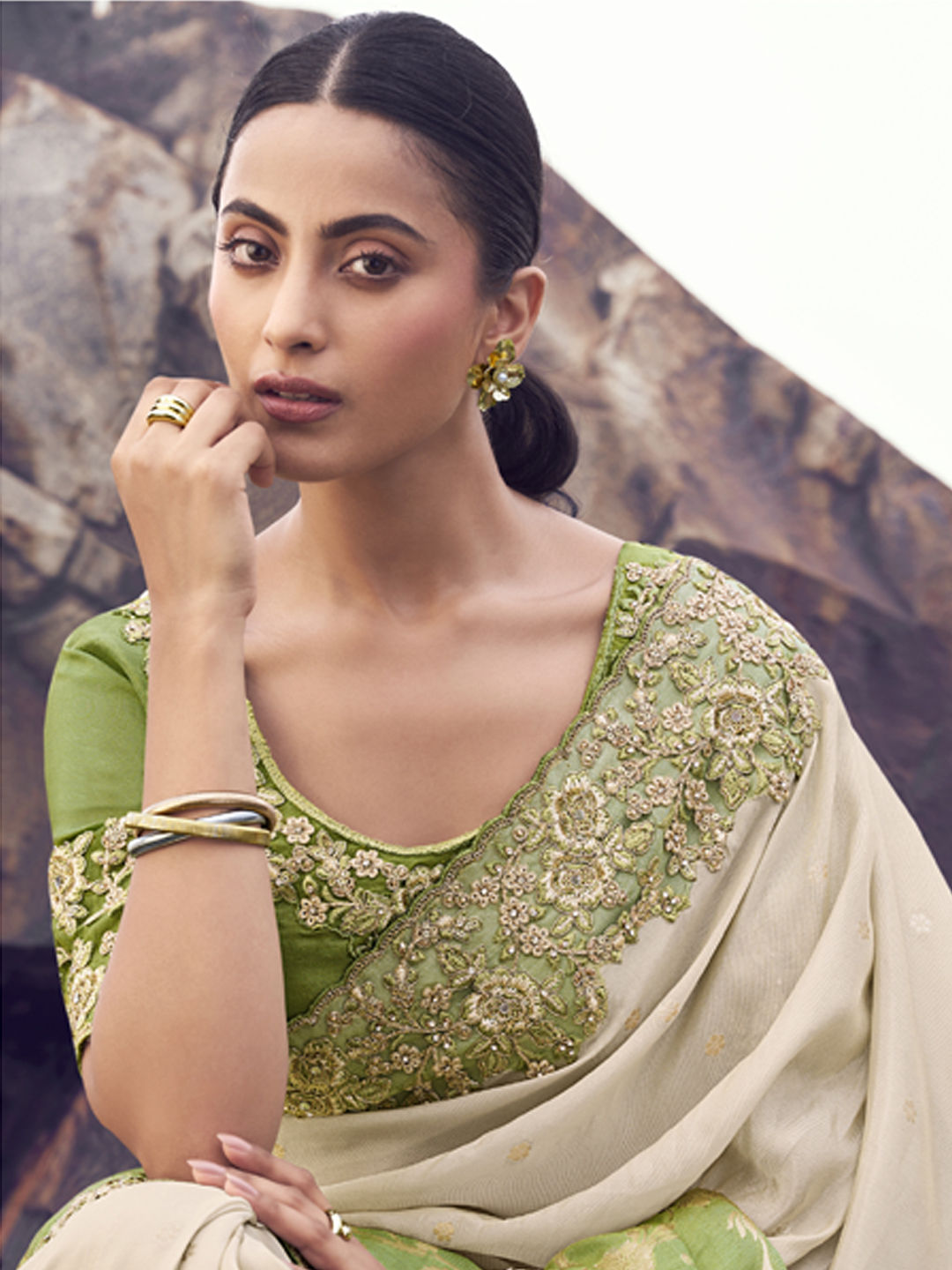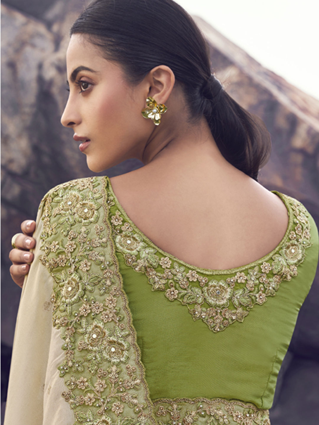 Beige and Brown, Green color Saree in Viscose fabric with Embroidered, Resham, Sequence, Thread, Zari work