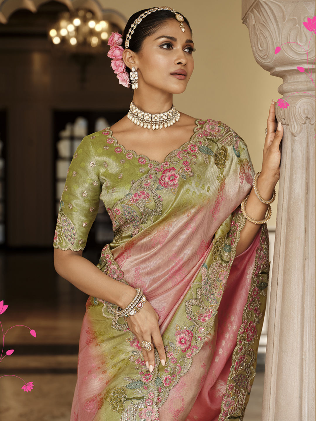 Viscose Bridal Saree in Pink and Majenta with Sequence work