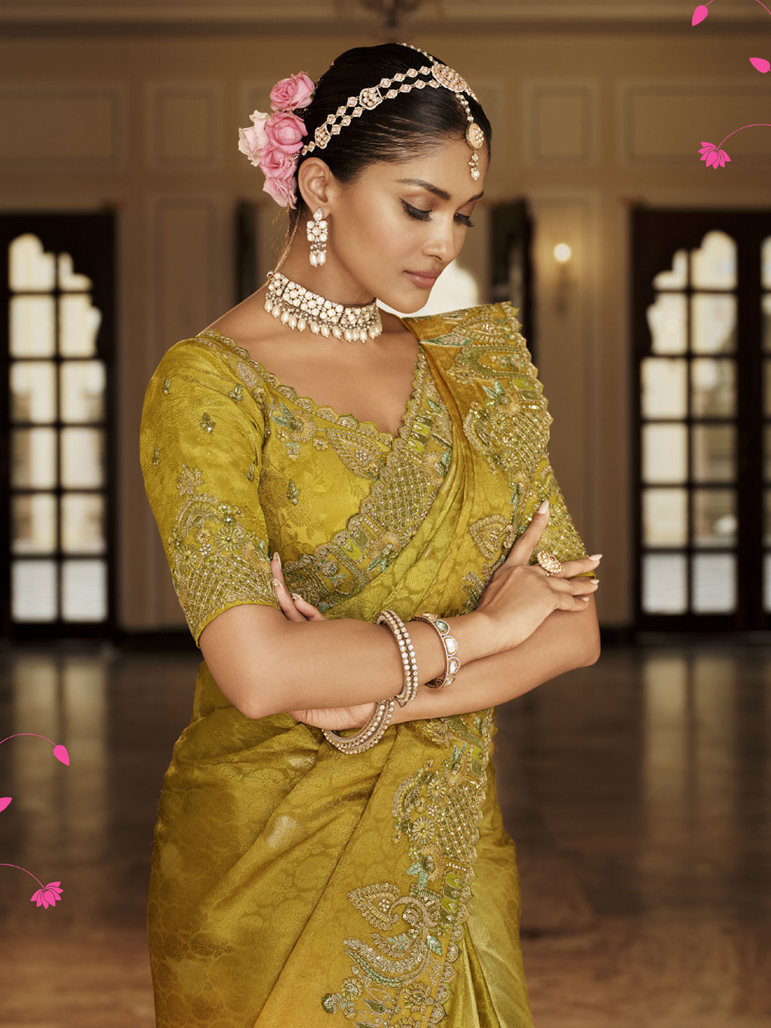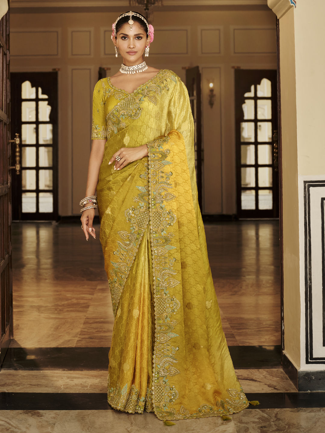Viscose Bridal Saree in Yellow with Embroidered work