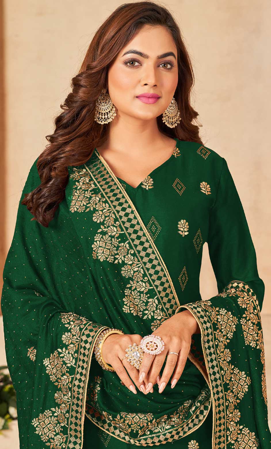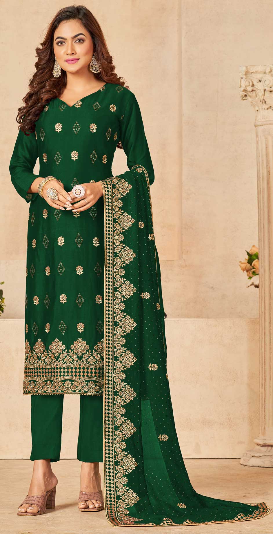 Green color Salwar Kameez in Art Silk fabric with Embroidered, Stone, Thread, Zari work