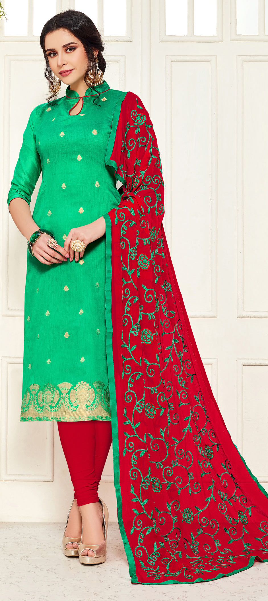 Green color Salwar Kameez in Banarasi Silk fabric with Embroidered, Thread work