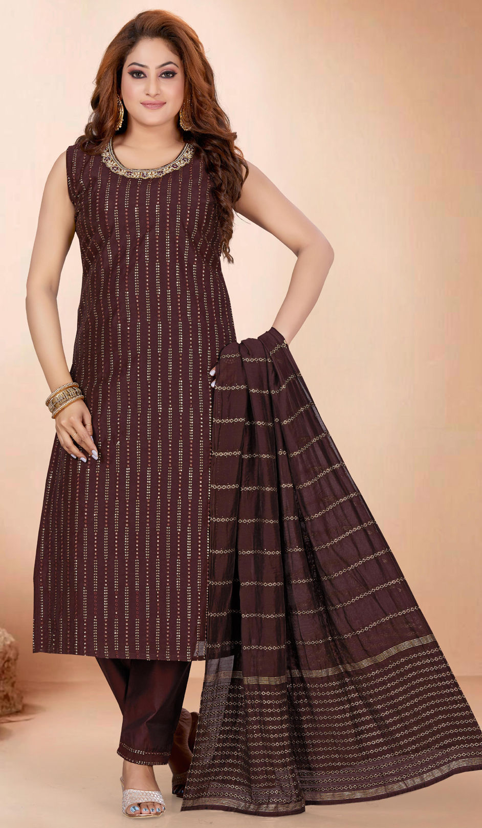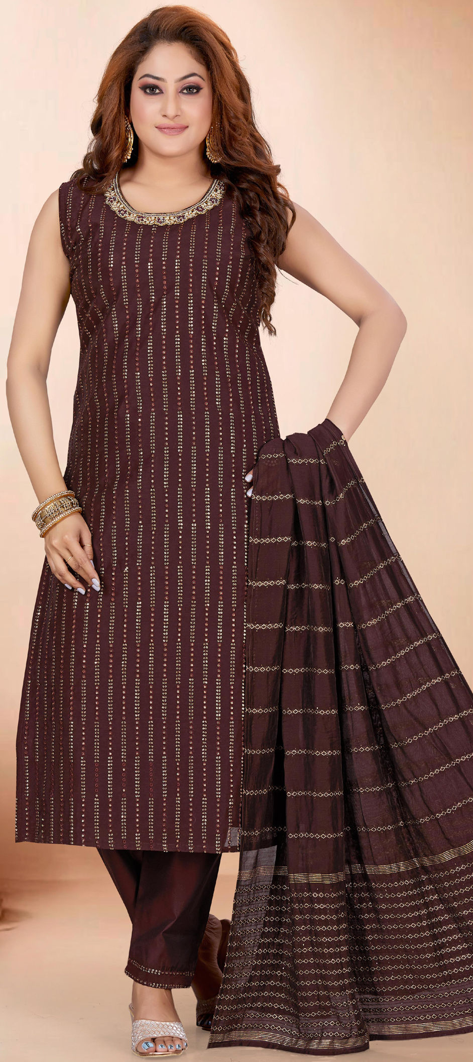 Beige and Brown color Salwar Kameez in Chanderi Silk fabric with Embroidered, Mirror, Sequence work