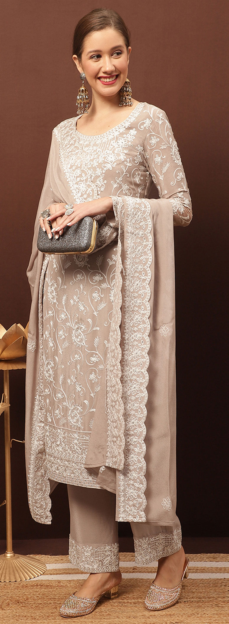 Beige and Brown color Salwar Kameez in Chiffon fabric with Embroidered, Resham, Thread work