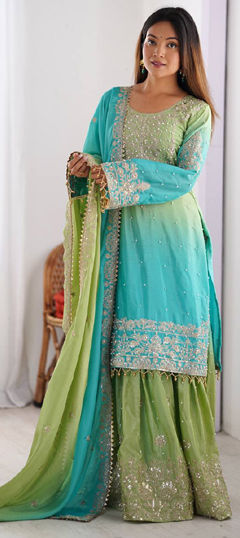 Green color Salwar Kameez in Chinon Silk fabric with Moti, Sequence, Thread work