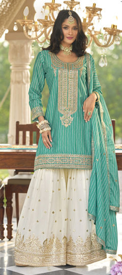 Blue, White and Off White color Salwar Kameez in Chinon Silk fabric with Bandhej, Digital Print, Sequence work