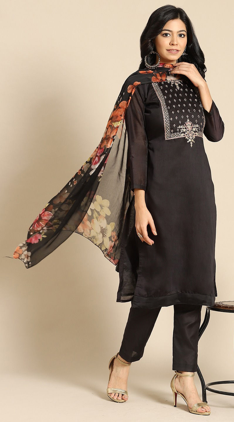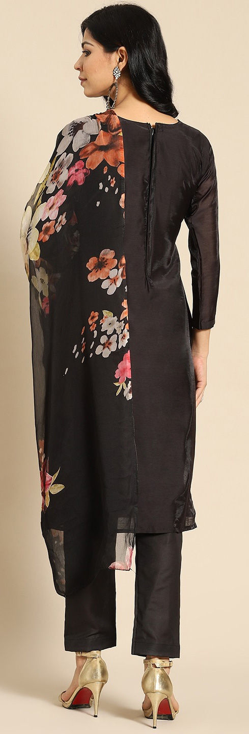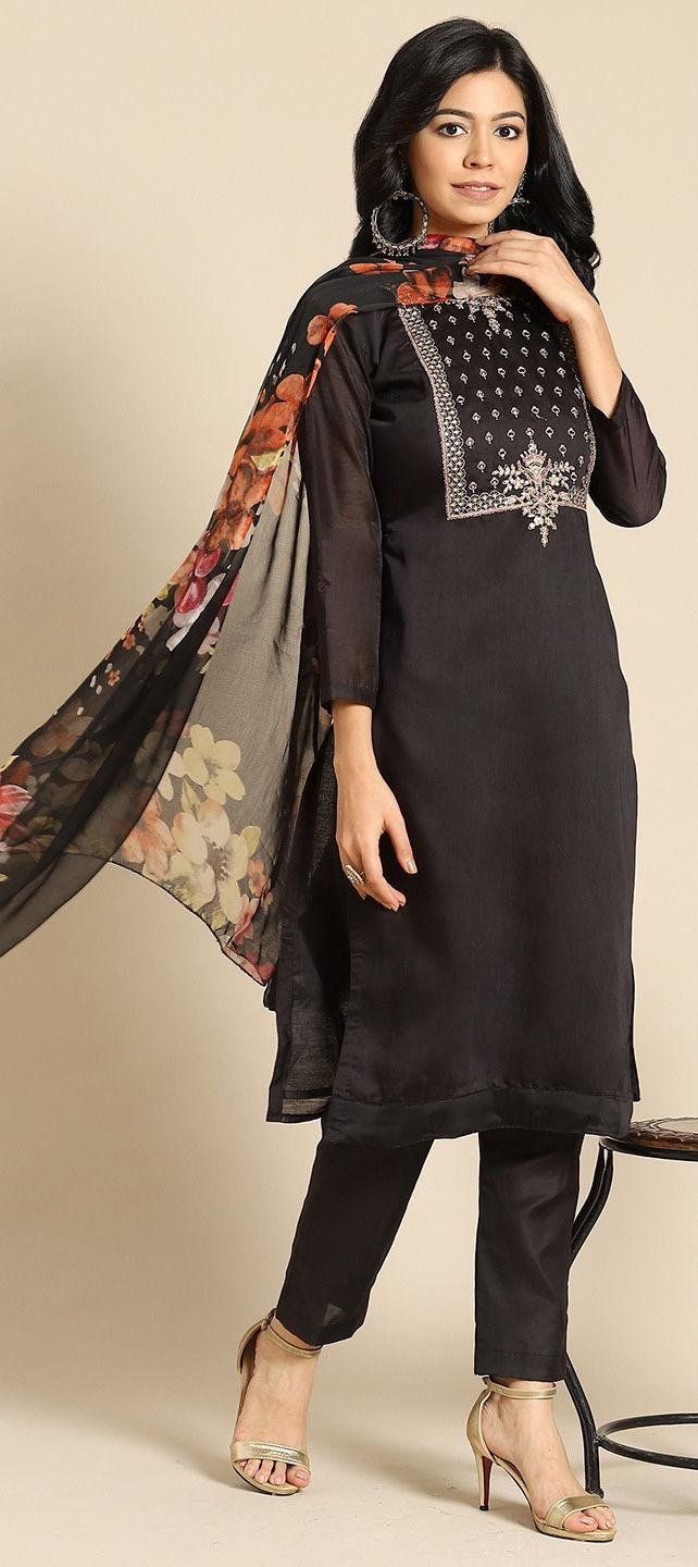 Black and Grey color Salwar Kameez in Cotton fabric with Embroidered, Printed, Thread work