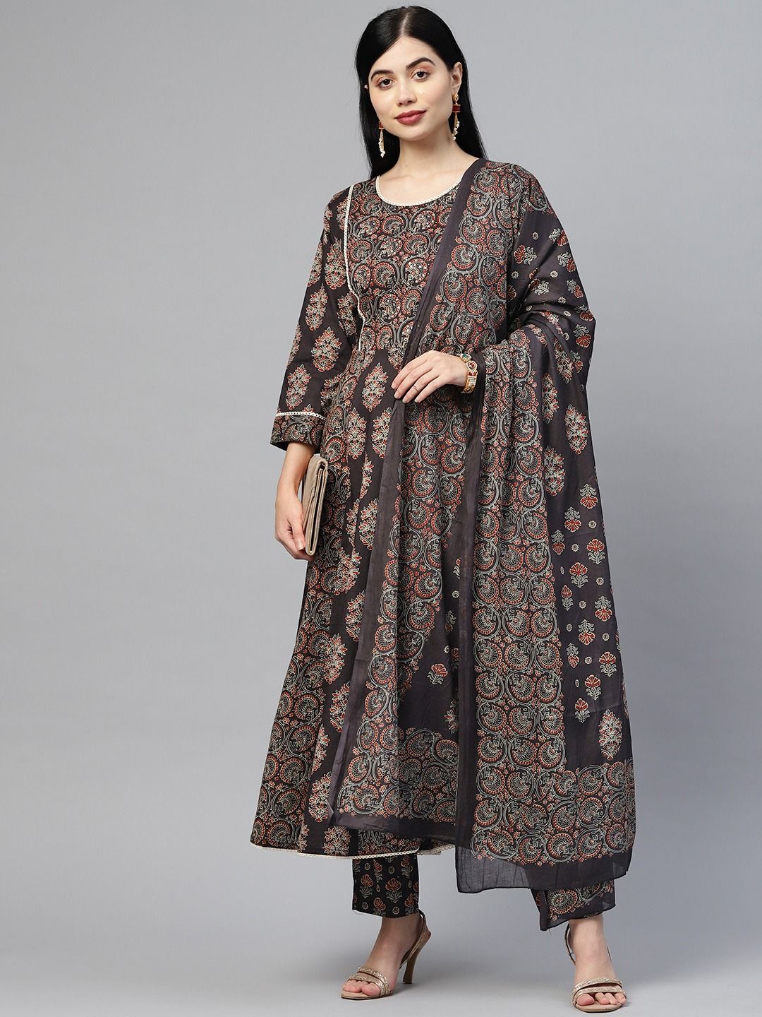 Black and Grey color Salwar Kameez in Cotton fabric with Printed, Sequence, Thread work
