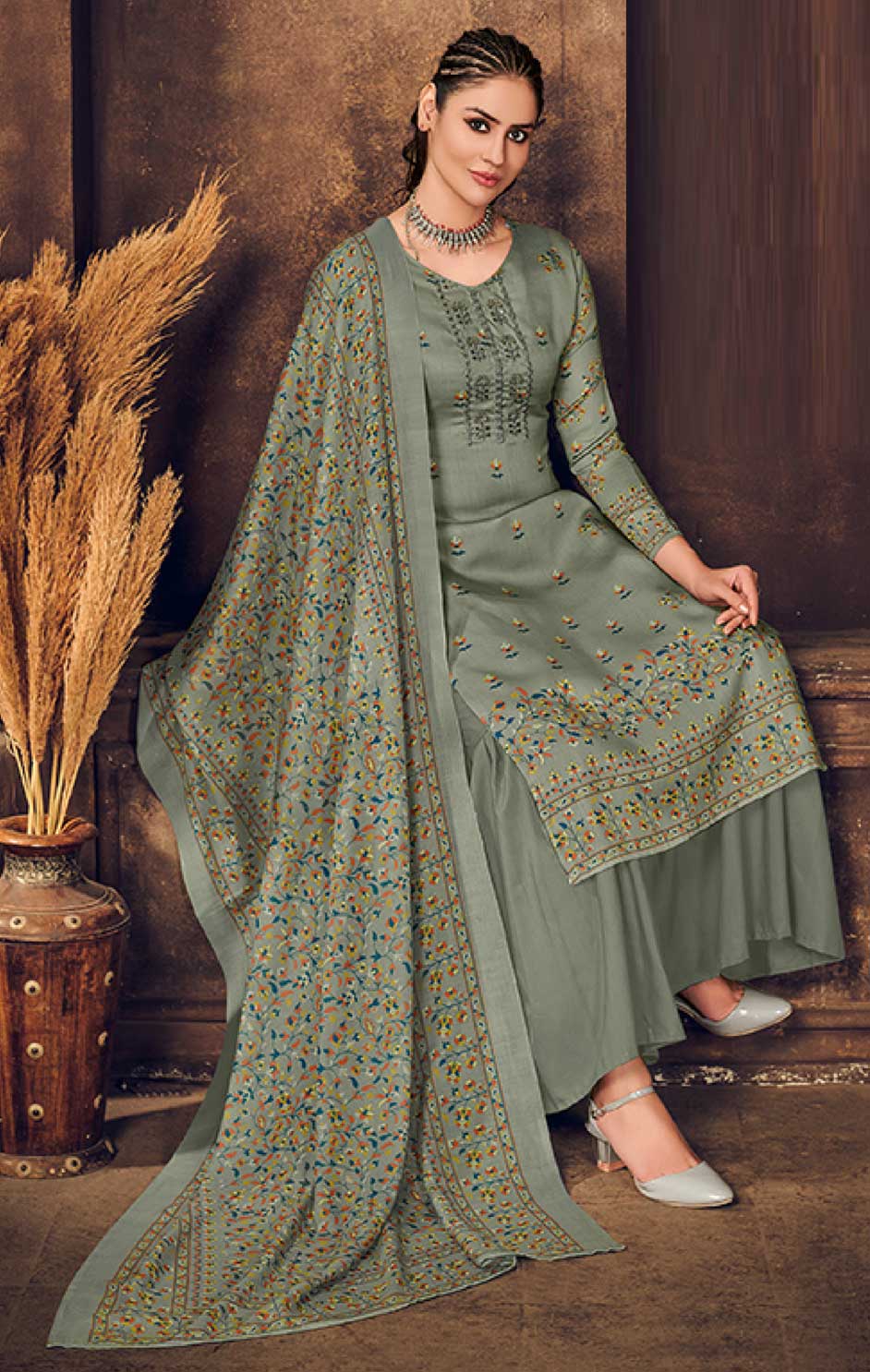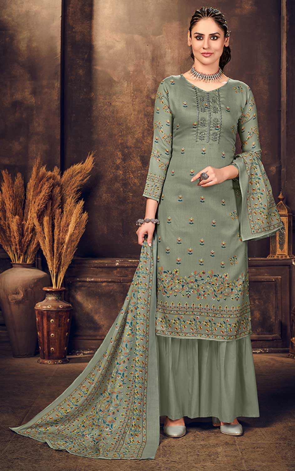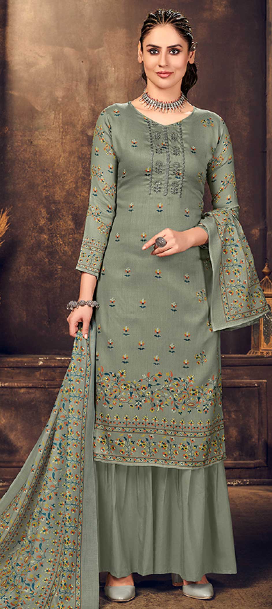 Green color Salwar Kameez in Cotton fabric with Digital Print, Embroidered work
