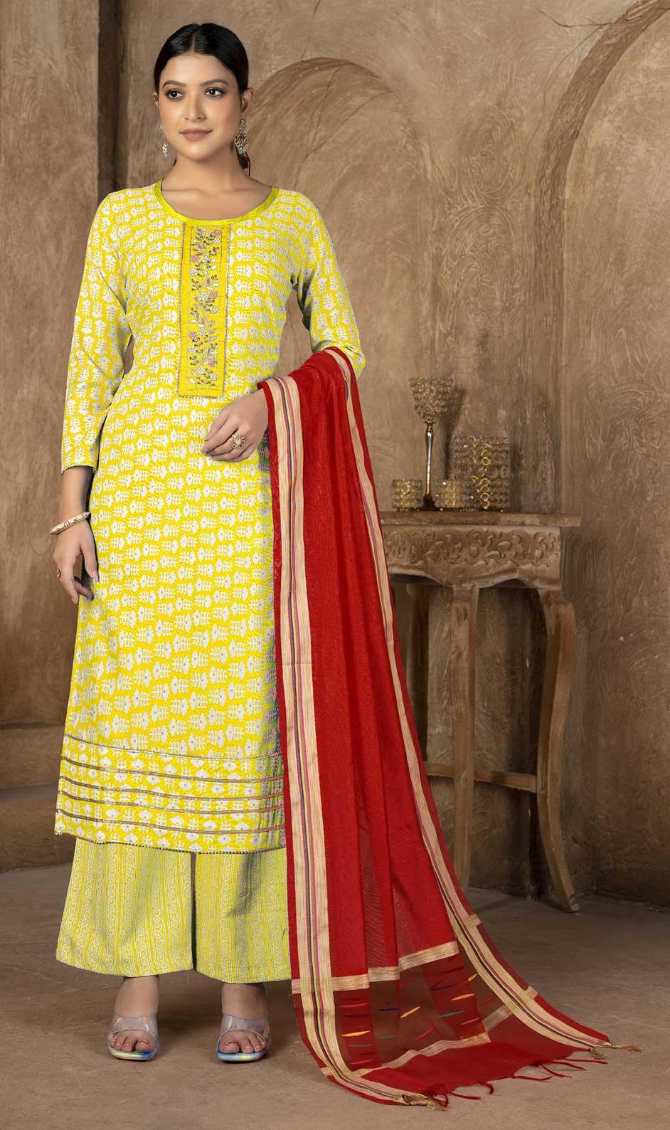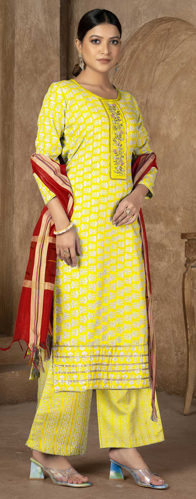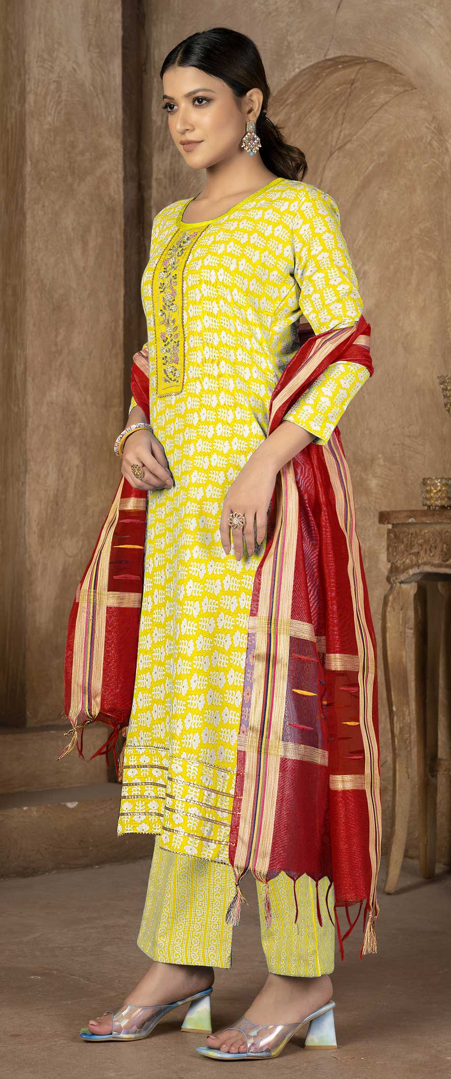 Yellow color Salwar Kameez in Cotton fabric with Printed, Sequence, Thread work