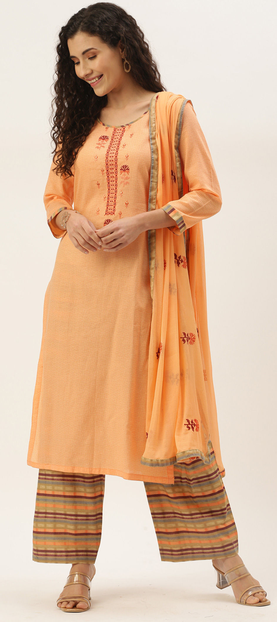 Gold color Salwar Kameez in Cotton fabric with Embroidered work