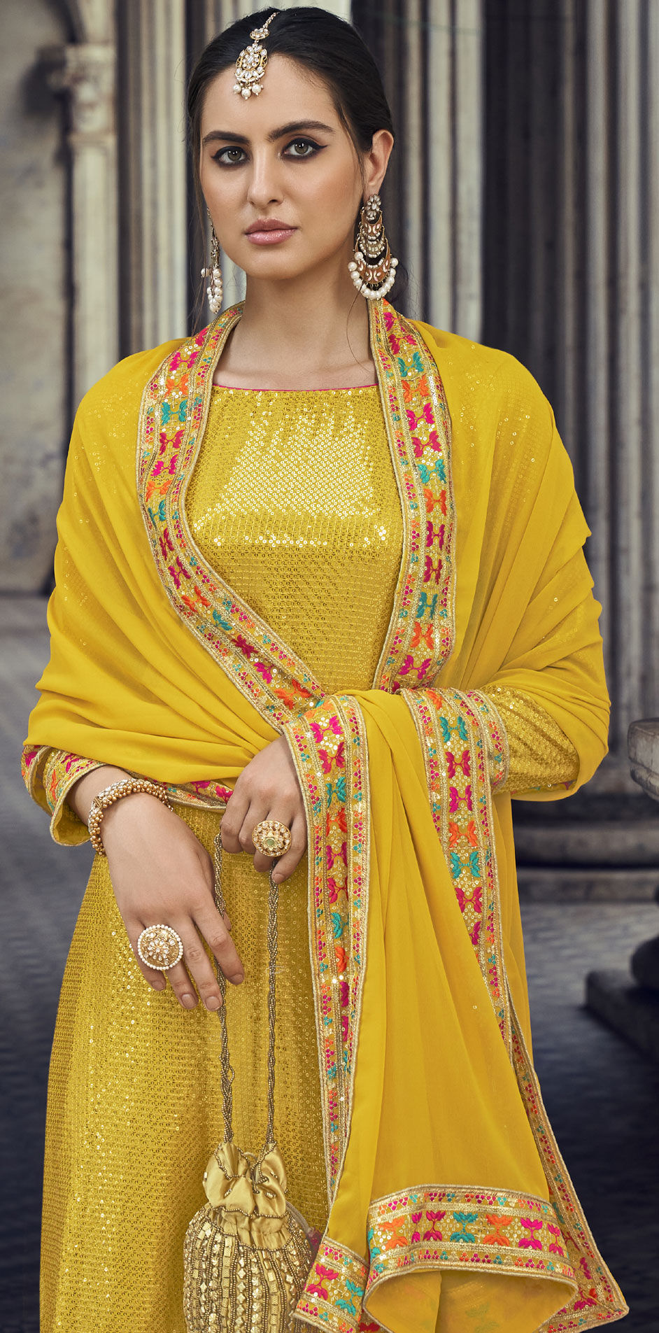 Yellow color Salwar Kameez in Cotton fabric with Embroidered, Sequence work