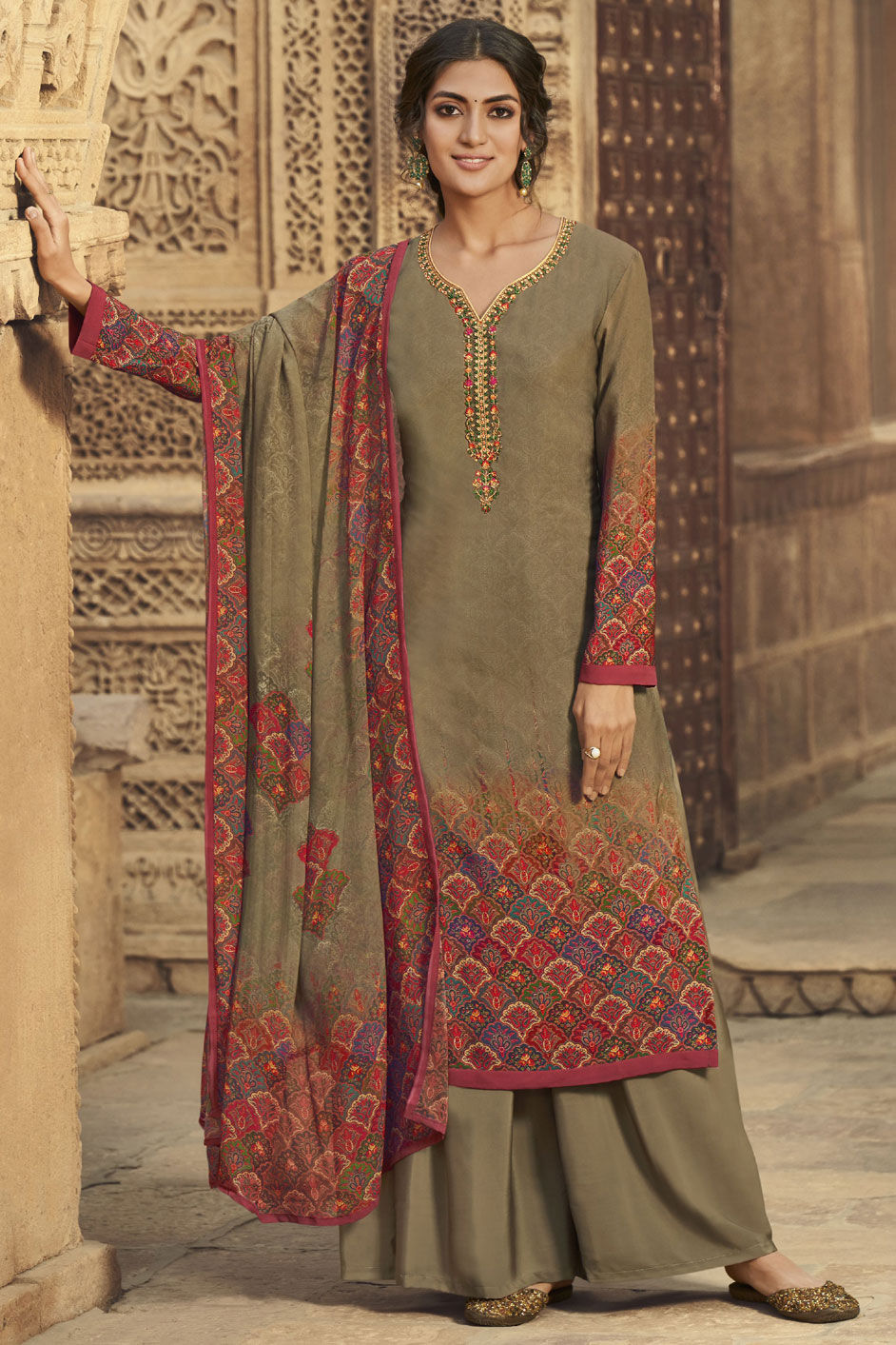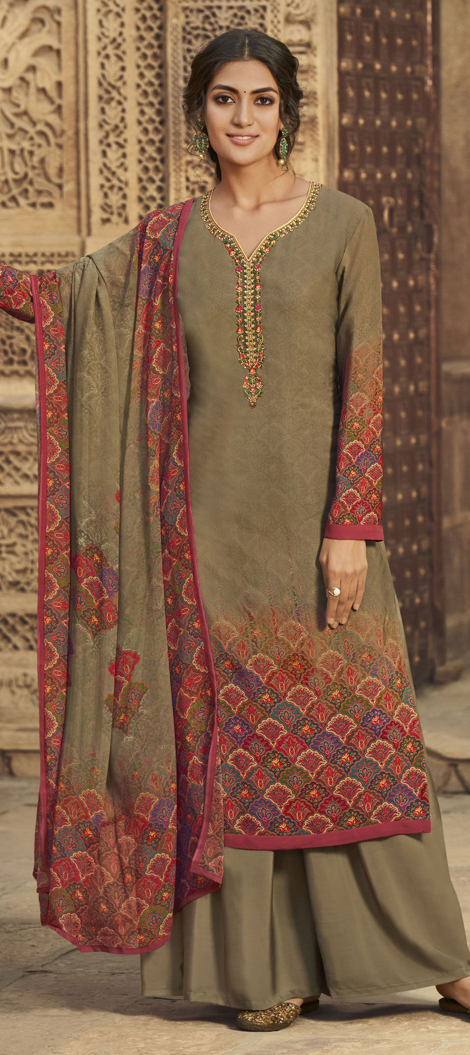 in Beige and Brown with Embroidered work
