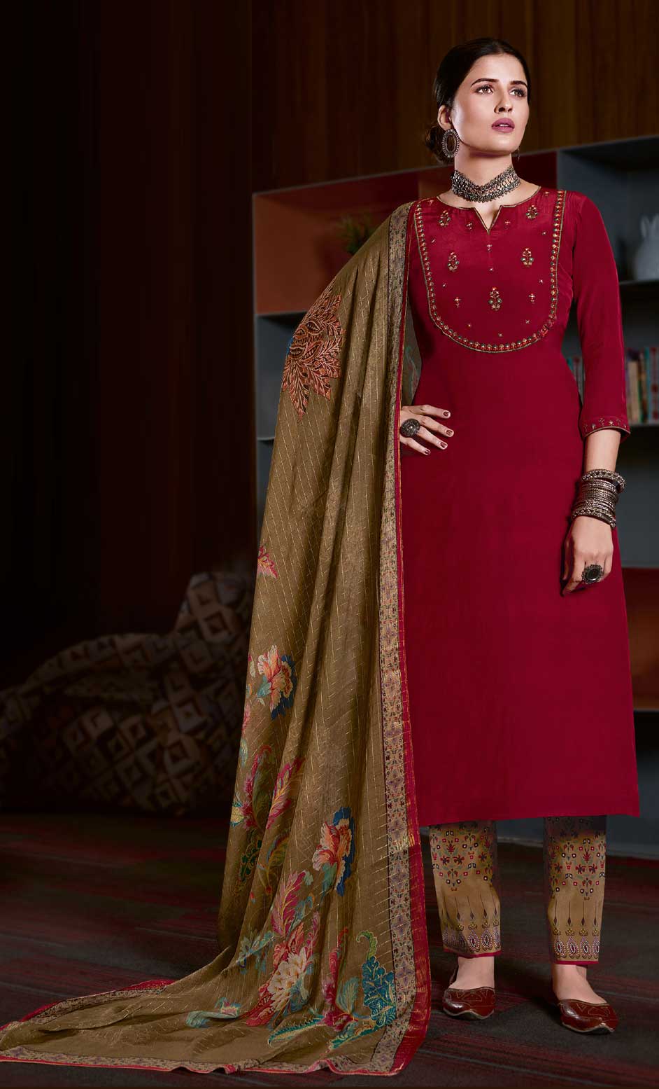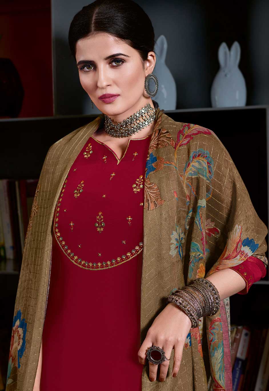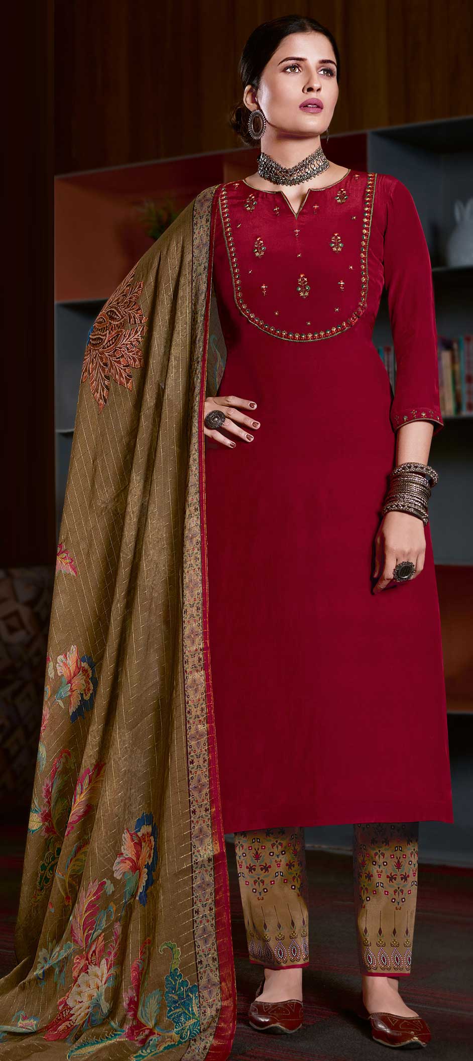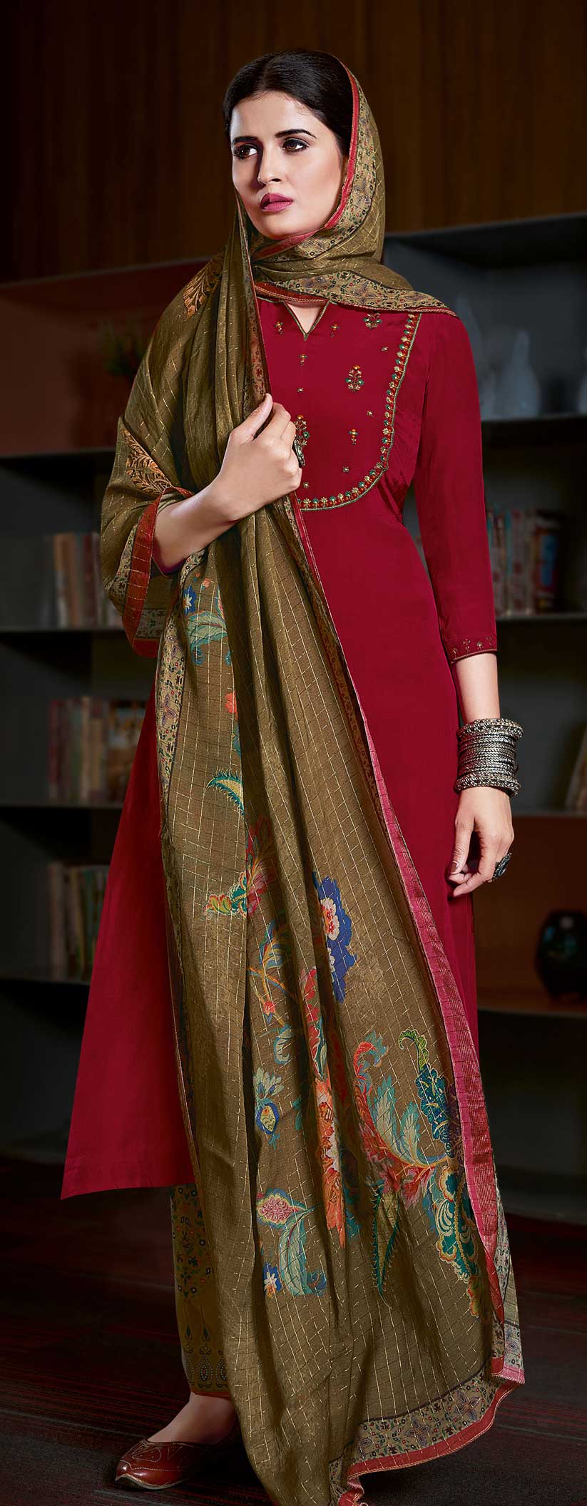 Red and Maroon color Salwar Kameez in Crepe Silk fabric with Digital Print, Embroidered, Resham, Zari work