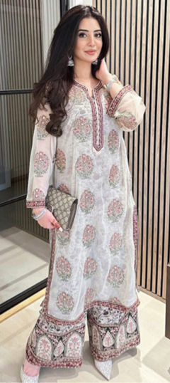 White and Off White color Salwar Kameez in Crepe Silk fabric with Floral, Printed, Sequence, Thread work