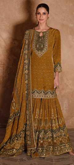 Yellow color Salwar Kameez in Crepe Silk fabric with Printed, Swarovski work