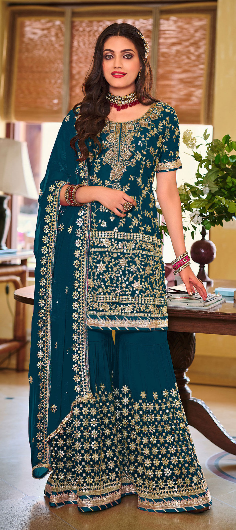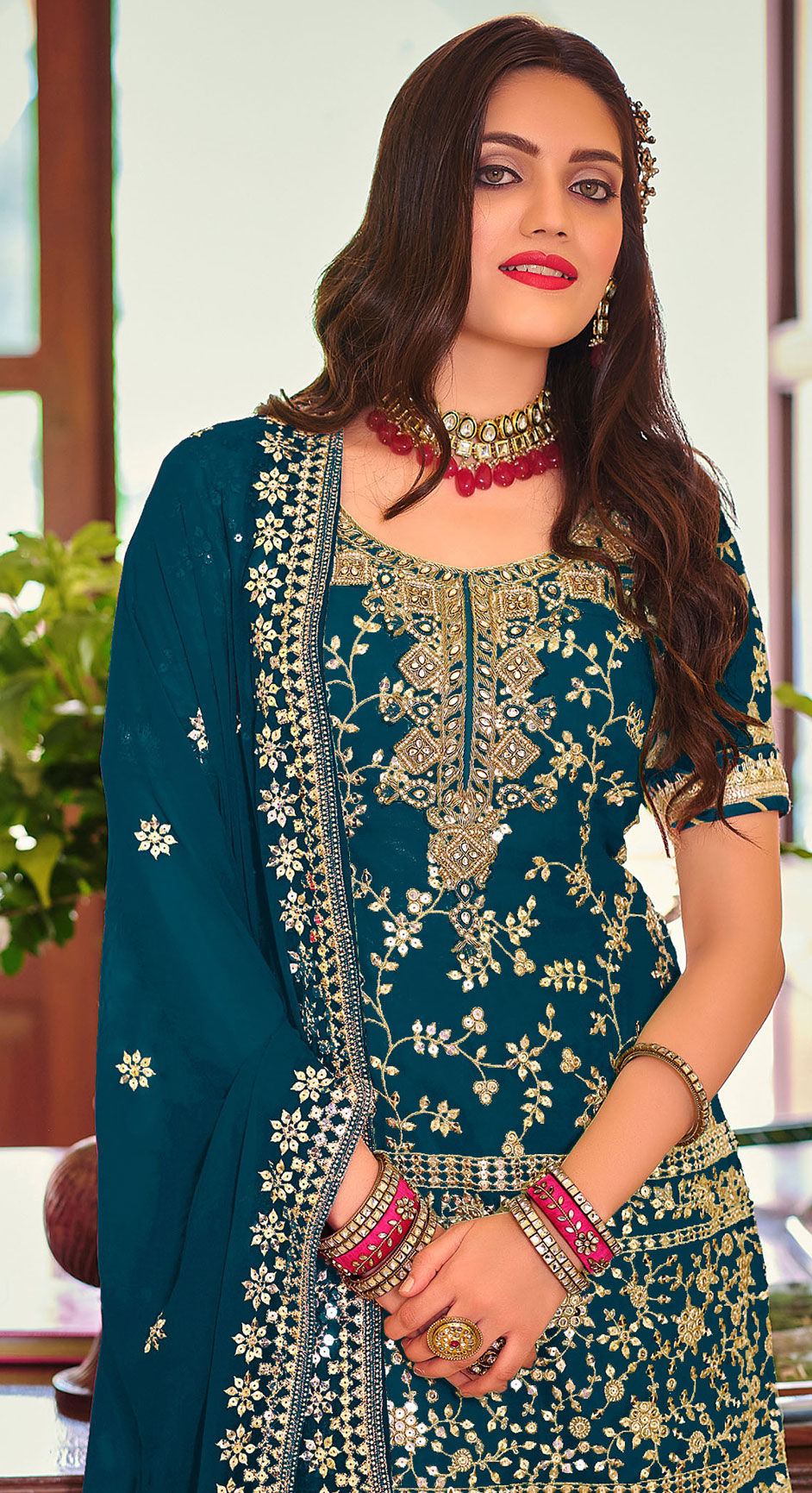 Blue color Salwar Kameez in Faux Georgette fabric with Embroidered, Lace, Sequence, Stone, Thread work