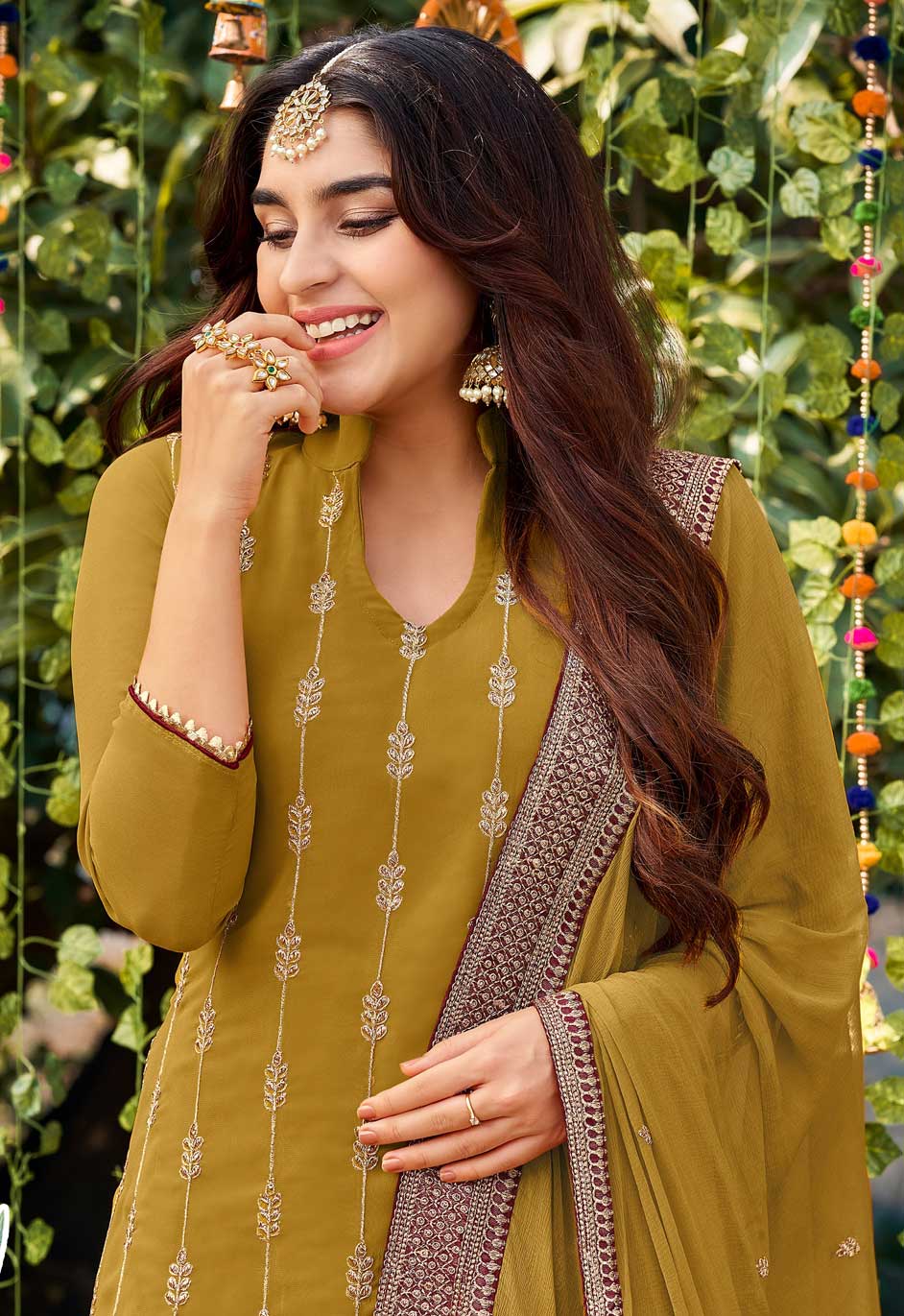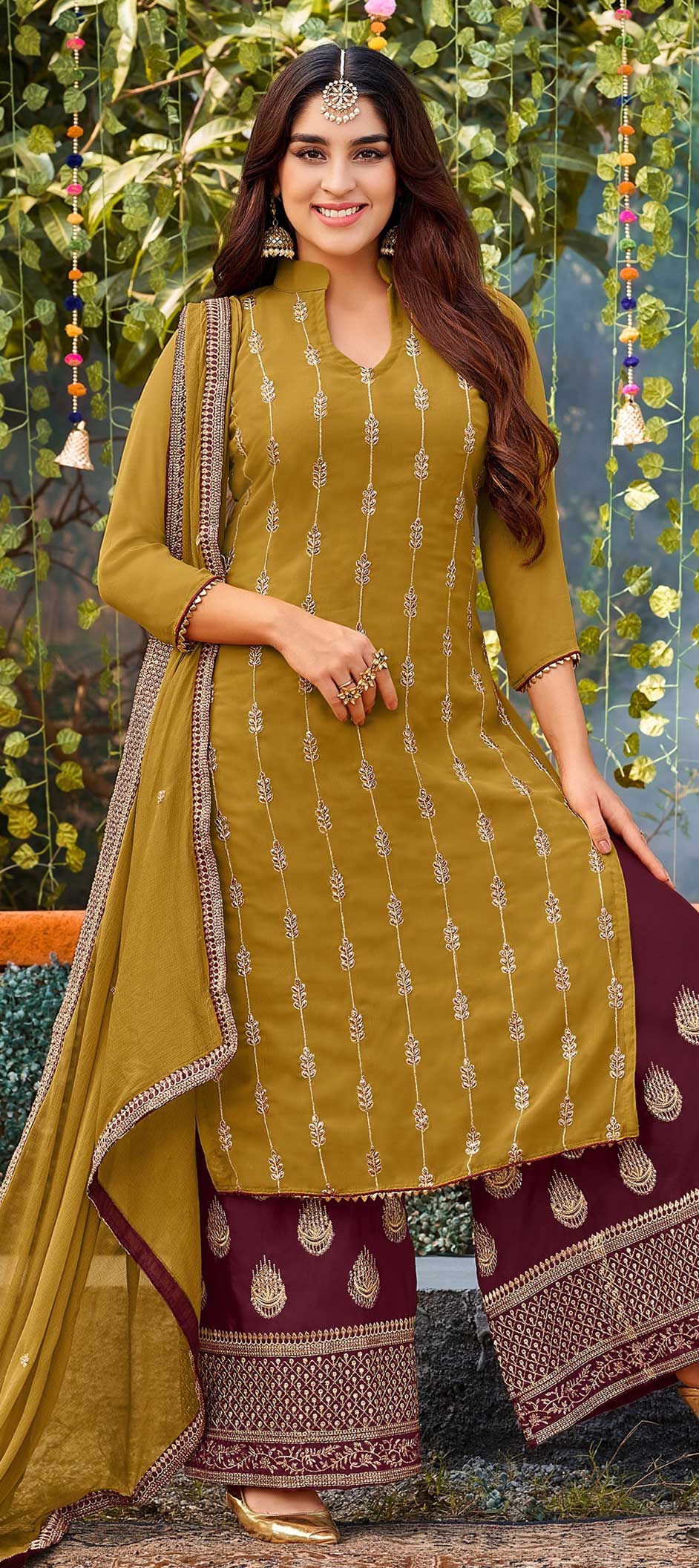 Yellow color Salwar Kameez in Georgette fabric with Embroidered, Lace, Resham, Thread work