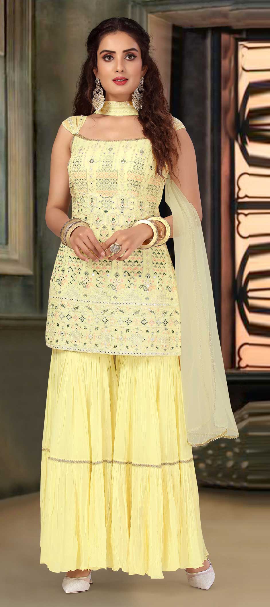 Yellow color Salwar Kameez in Georgette fabric with Embroidered, Resham, Sequence, Thread work