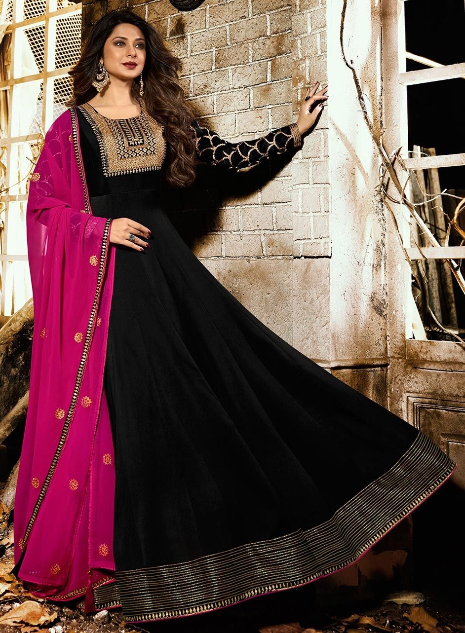 Black and Grey color Salwar Kameez in Georgette fabric with Embroidered, Lace, Resham, Stone, Thread, Zari work