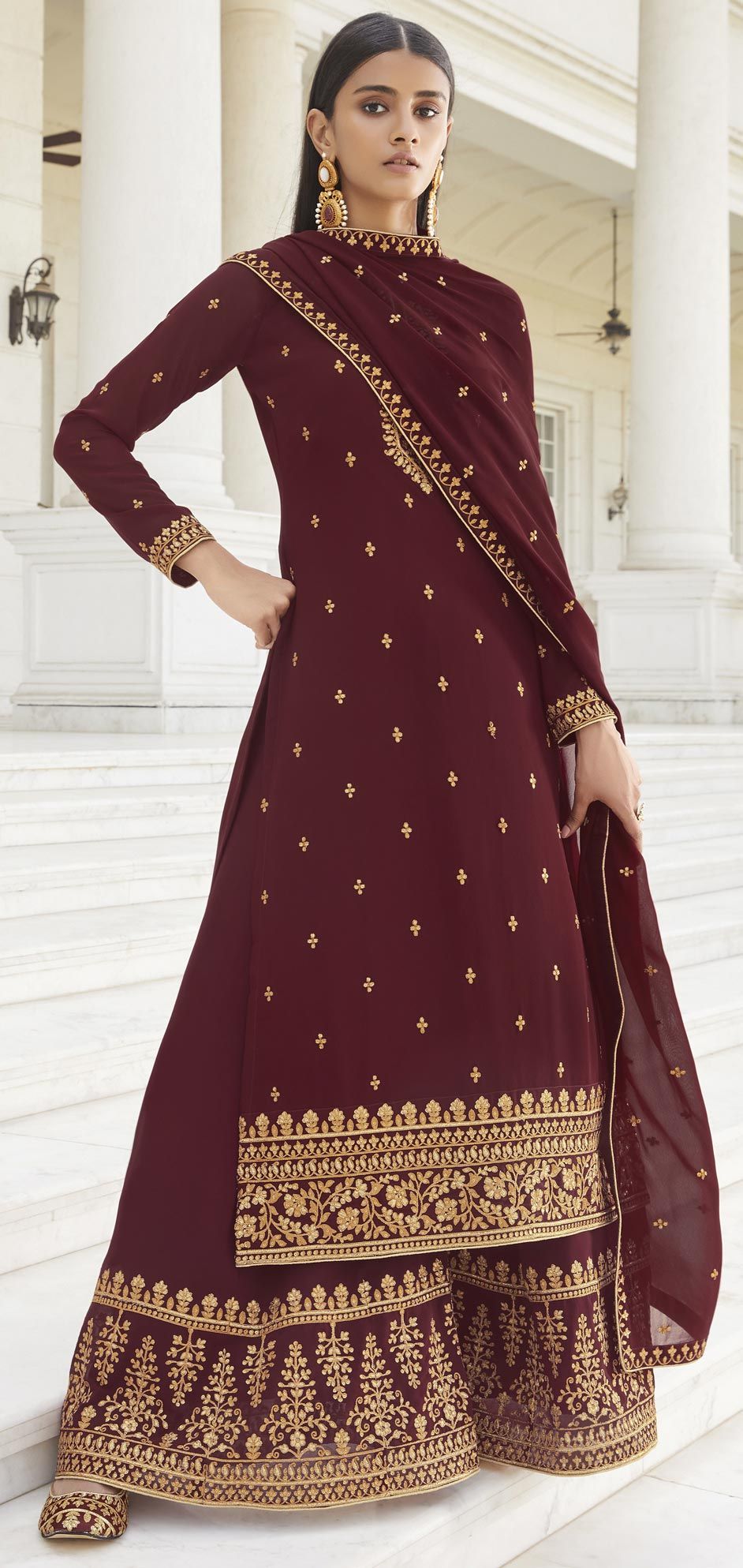 Red and Maroon color Salwar Kameez in Georgette fabric with Embroidered, Sequence, Thread, Zari work