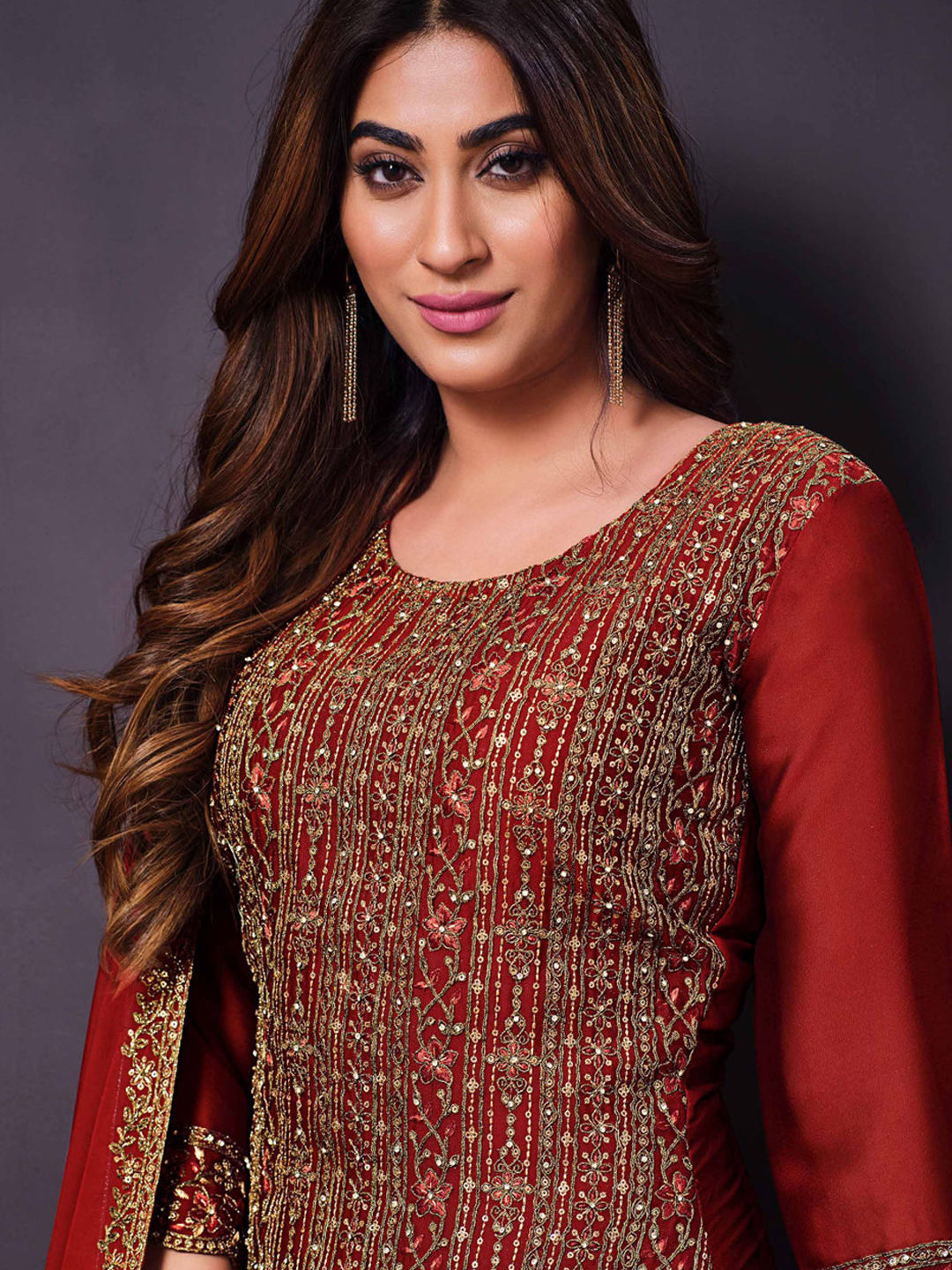 Red and Maroon color Salwar Kameez in Georgette fabric with Embroidered, Sequence, Thread work